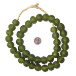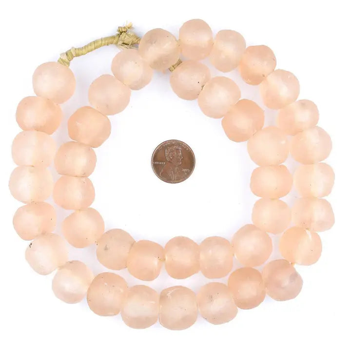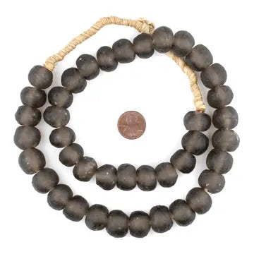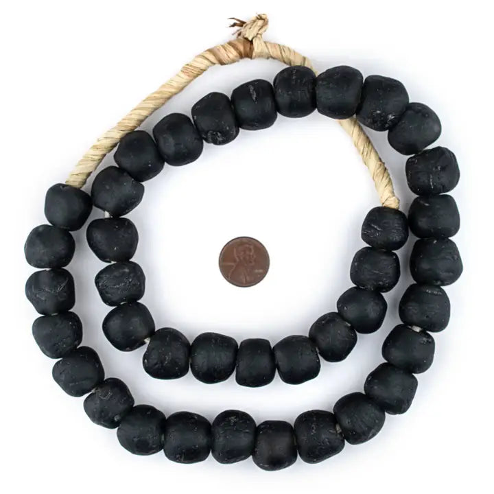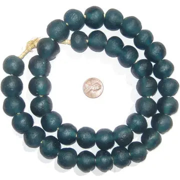 These great beads are made by the Krobo People of Ghana, Africa. Powder glass beads are made by crushing glass to a fine powder and heating it so that the particles fuse together. The glass is then poured into clay molds, with a cassava leaf stem used to make the hole. They are baked in an oven and the glass fuses and the cassava stem burns up. This technique has been used in Africa for centuries.