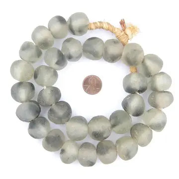 Take a look at this exceptionally large strand of jumbo-sized recycled glass beads. Large beads such as these are hard to find and even harder to find in good condition. The journey from Africa can sometimes be unkind to such large beads! These beads are sure to make an impression wherever they go. Use them as centerpieces for special jewelry, as adornments for interior design, or even as a wall hanging to decorate your favorite room. You will receive a 30" strand with approximately 33 beads.