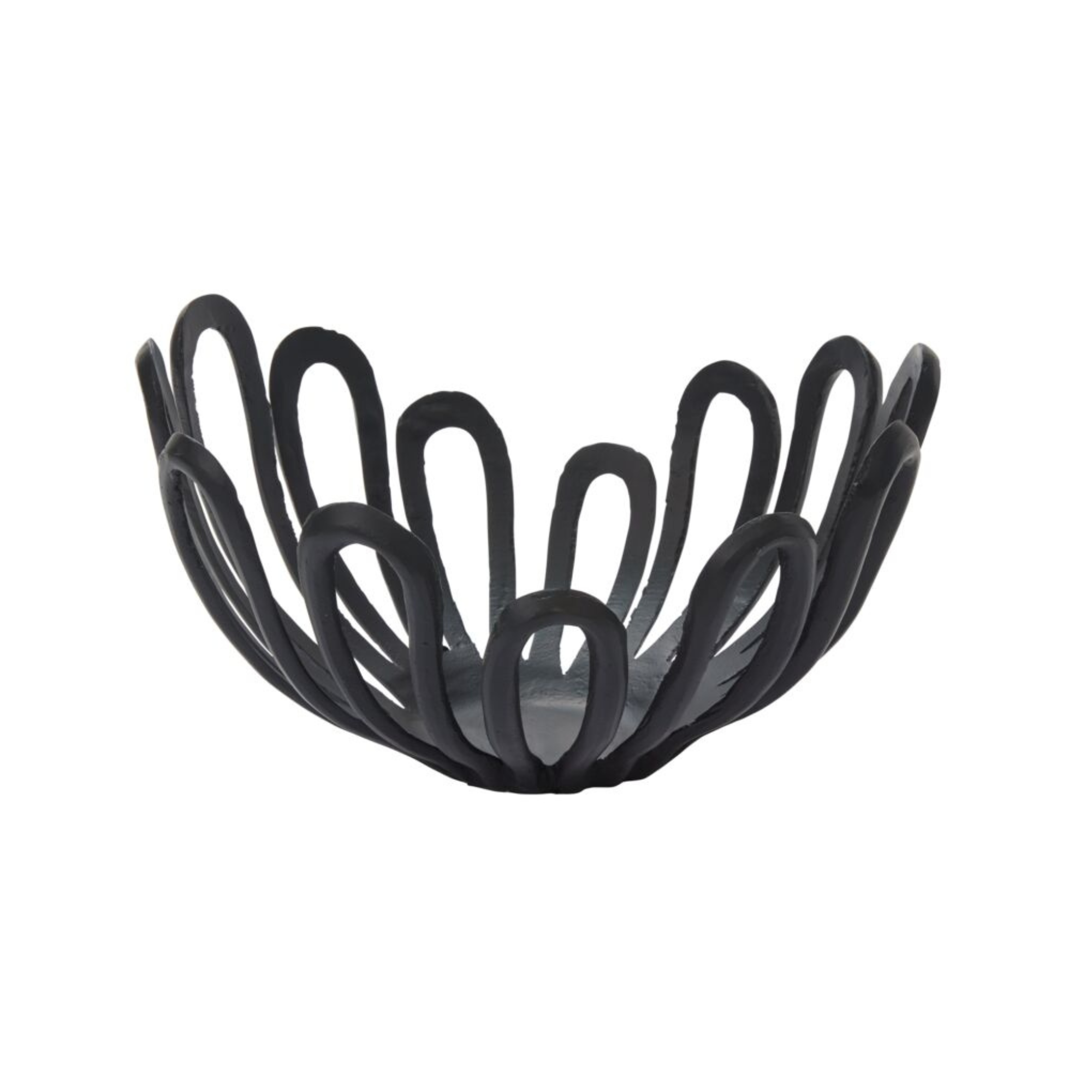 Give coffee table & shelf displays an upgrade with the sculptural form & stunning shape of the cast aluminum open decorative Altamonte Bowl in black. Large open petal shapes extend from the center base, curve upwards, & stop at varying heights. This versatile piece can be styled with fruit as kitchen decor, on its own as a decorative object, filled with a moss layer for an orchid or other planting, & much more.