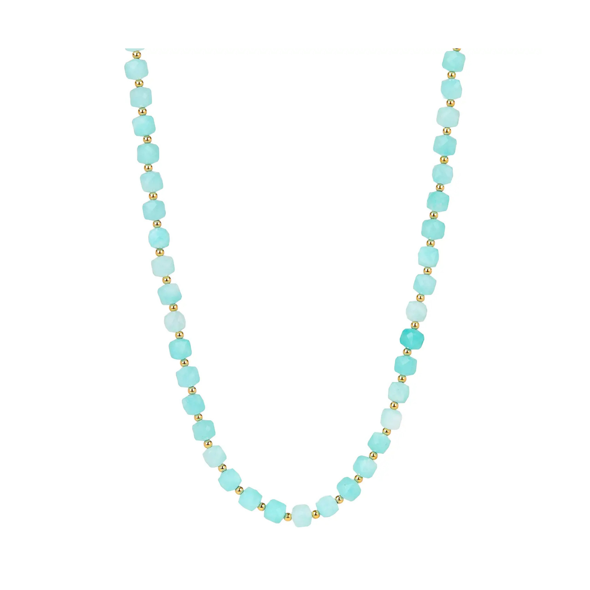 This elegant beaded necklace features alternating amazonite stones and polished gold beads, creating a balanced and refined look. Slightly chunky for presence yet versatile in style, it brings a subtle pop of color and texture to both casual and dressy ensembles. A timeless piece that effortlessly elevates any outfit.