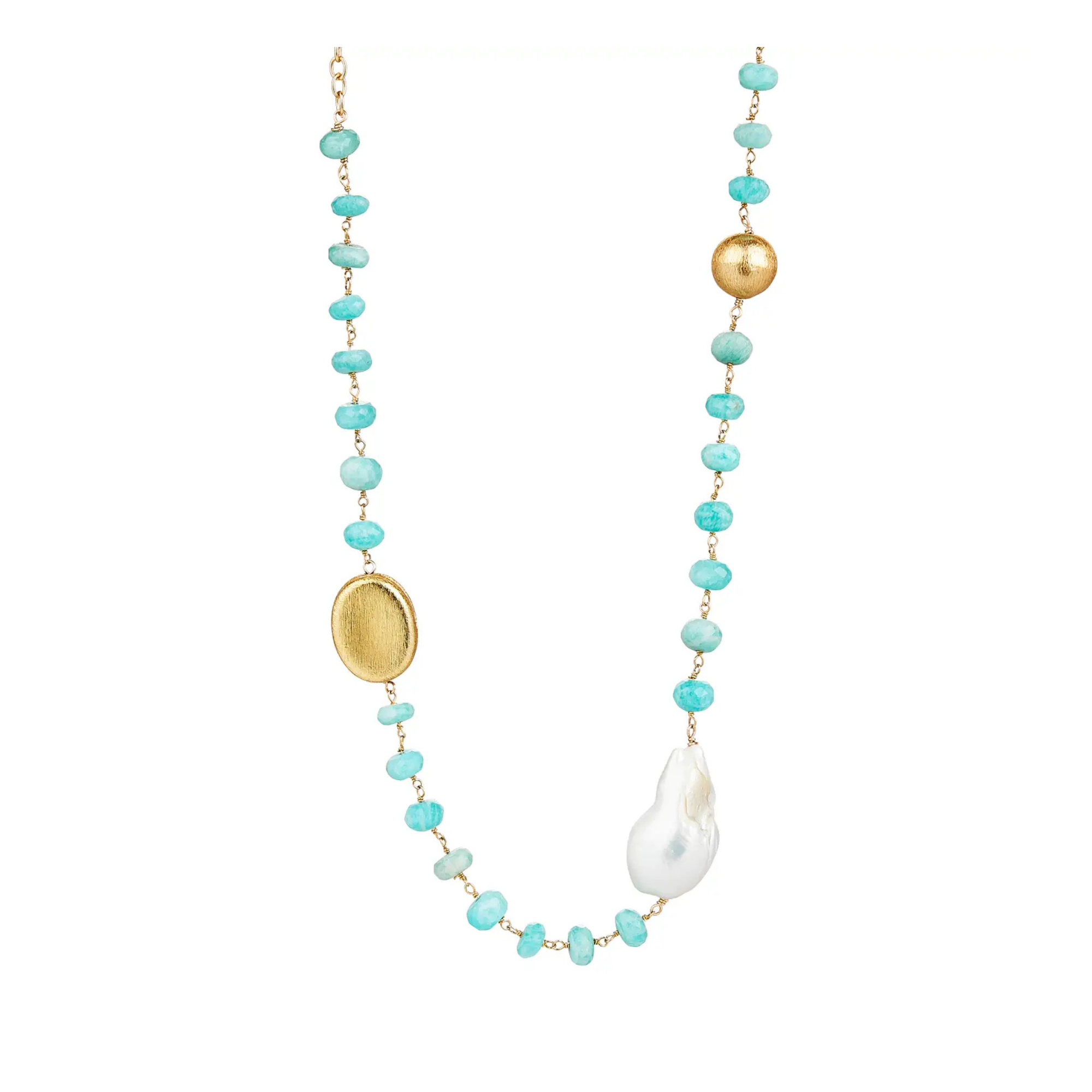 Experience classic elegance with the Amazonite Necklace with Pearl and Gold Beads. This beautiful necklace features a combination of smooth amazonite beads, lustrous pearls, and gleaming gold accents. The harmonious blend of these elements creates a sophisticated and versatile piece, perfect for enhancing any outfit.