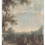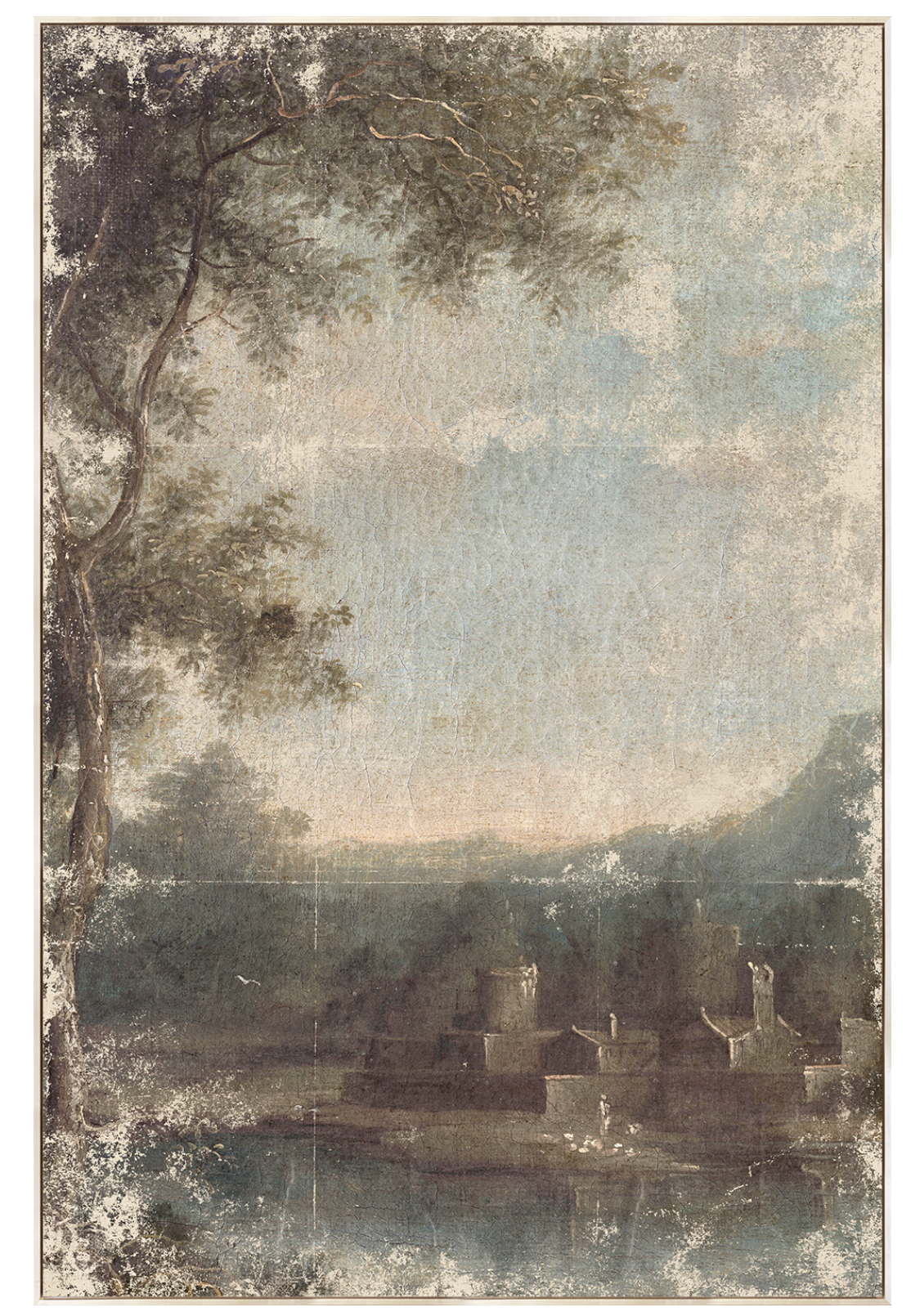 Soft greens and creamy blues help to create this romantic Italian vista. The distressed creases and fresco-like texture adds a timeless feel. Painted in 1864, this piece has aged beautifully.