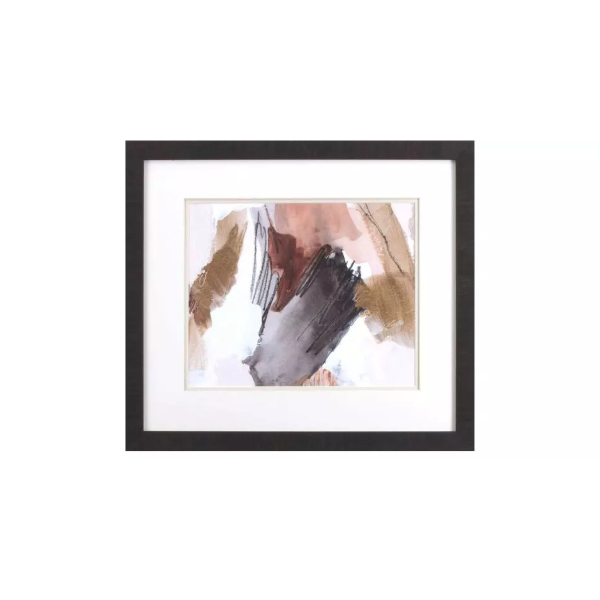 A set of two abstract brushstroke prints in brown and beige are double matted in white and oyster. Framed in a dark espresso wood finish moulding