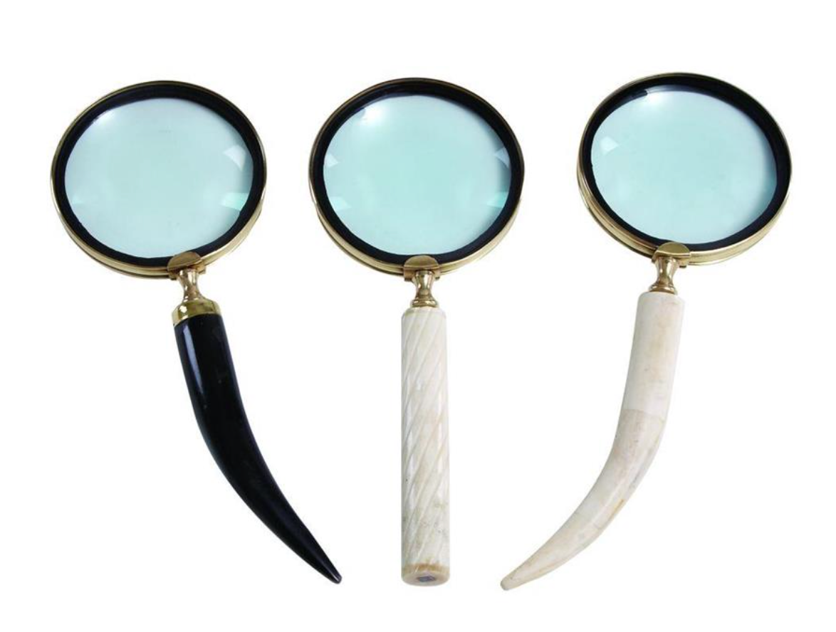 Metallic gold rims wrap around the large magnifiers; 3 handle shapes: one black horn, one white horn, and one white cylinder handle with diagonal etched lines and gold hardware at the tip