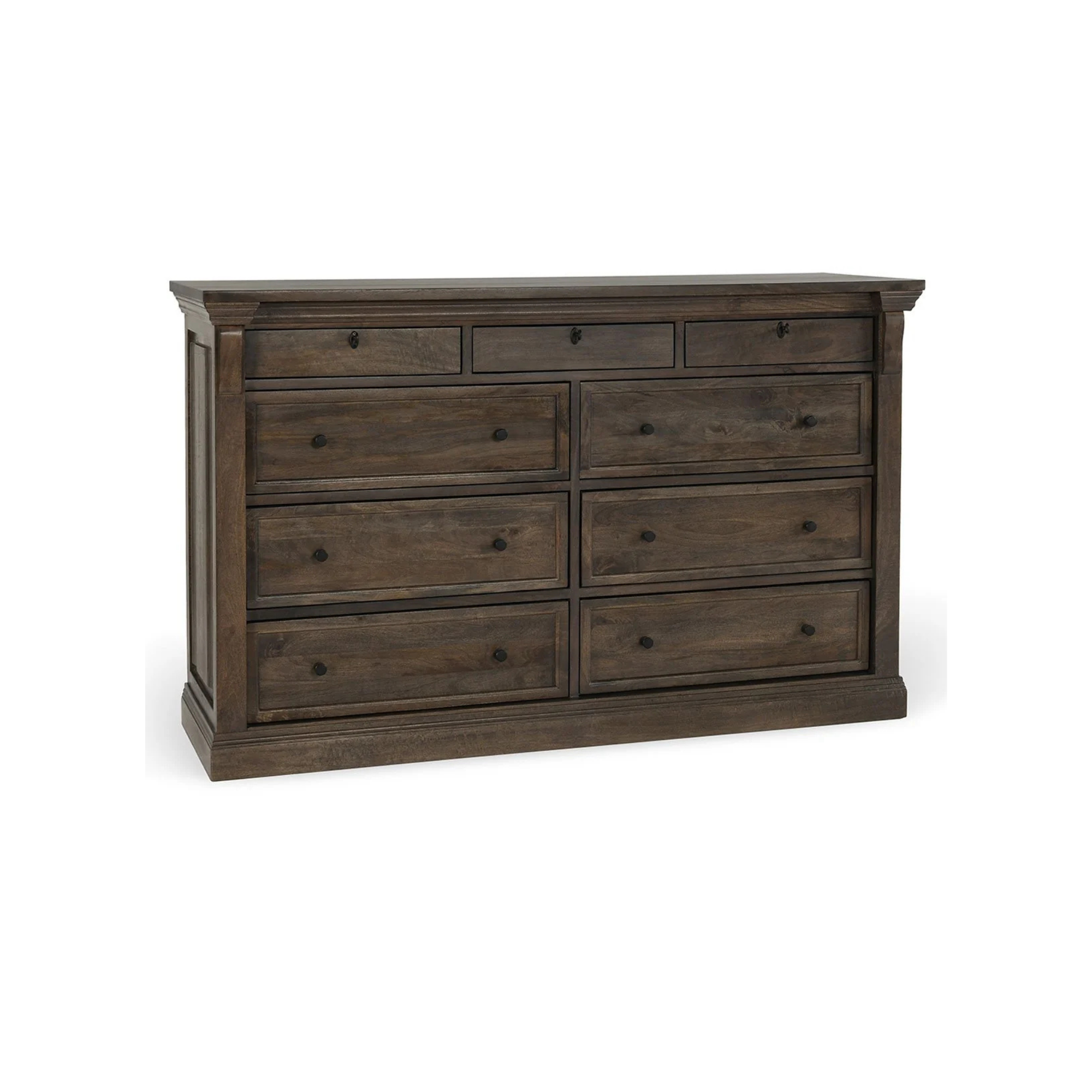 Crafted from sustainably sourced mango wood, the Ava Dresser showcases distinctive grain variations and time-honored design details. Hand-finished with precision, this piece features beveled edges, decorative cornices, and an ornamental center key that elevate its visual appeal. The combination of natural wood character and classical proportions makes it a versatile addition to traditional and transitional interiors, offering both substantial storage capacity and enduring aesthetic value.