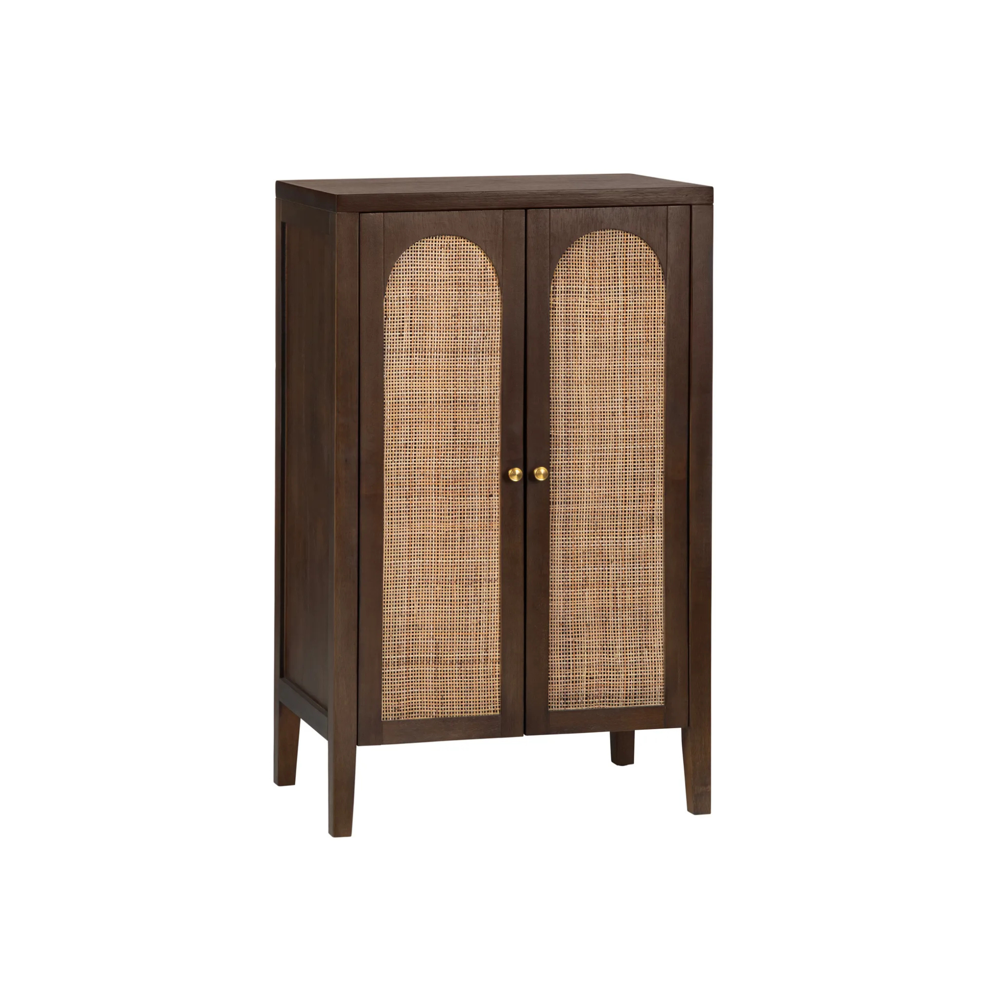 This elegant storage solution features a natural wood finish complemented by distinctive rattan-detailed arched cutouts that add visual interest and contemporary appeal. The three-shelf interior provides ample space for organizing books, décor, or everyday essentials while maintaining a refined aesthetic. A versatile piece that seamlessly integrates into modern or transitional interiors.