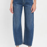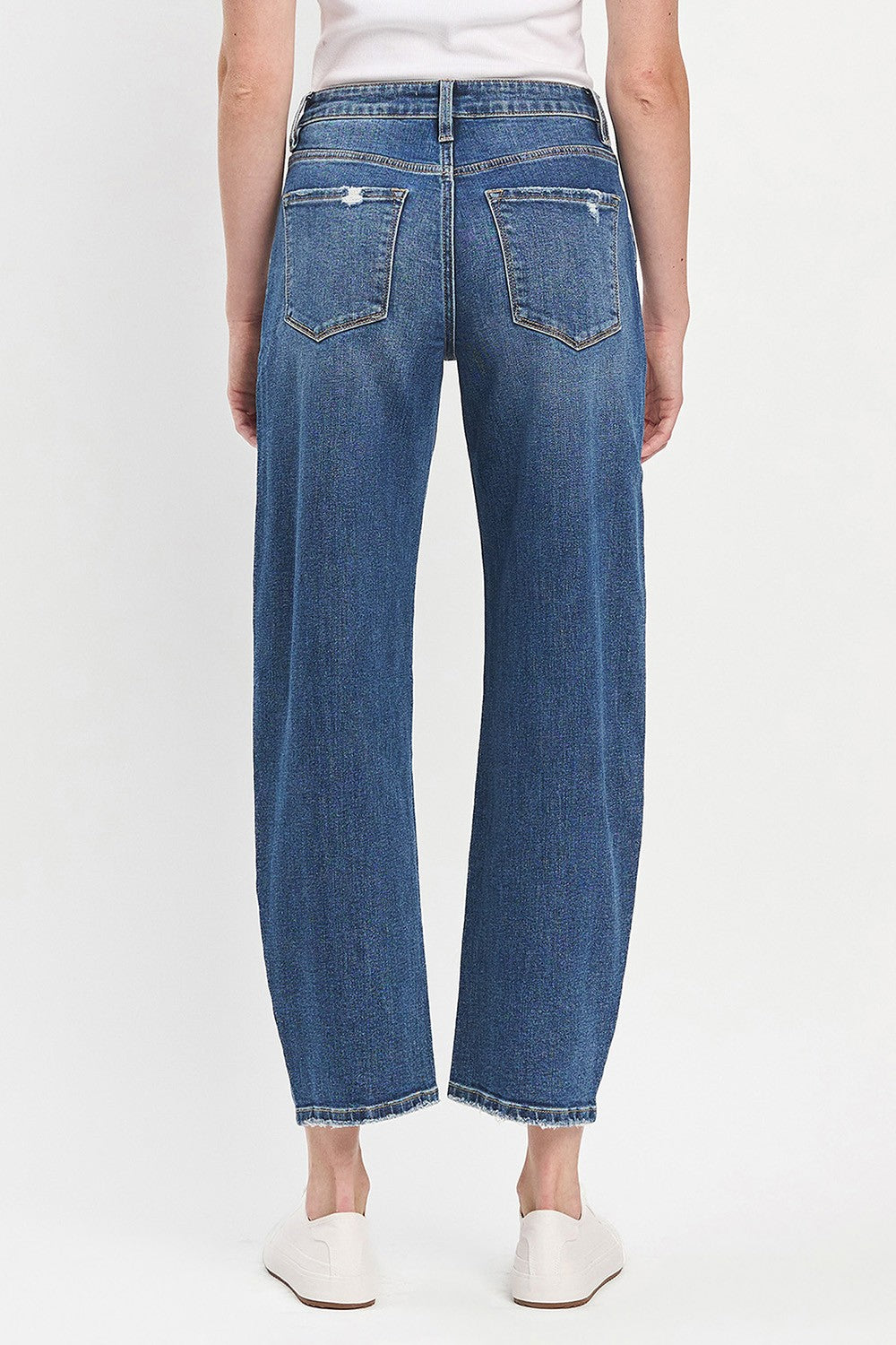 Elevate your denim collection with these expertly crafted barrel jeans featuring a flattering high-rise silhouette and versatile medium dark wash. The comfort stretch fabric moves with you throughout the day, while subtle distressing adds contemporary edge. Designed with a classic five-pocket construction and finished at the ankle for a modern, cropped proportion. Rise: 10½" | Inseam: 28" | Leg Opening: 15"