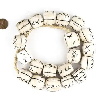 Admire this unusual strand of bone beads from Kenya. While Kenyan bone beads are common in a variety of shapes and styles, these beads come in a hard-to-find cylinder shape. East African bone beads are handcrafted by artisans using recycled cow bone. Each bead is individually carved and polished, and is truly one of a kind. These beads measure approximately 25-27 x 22-24mm, with a hole size of 3mm. Strands measure approximately 26", and have approximately 20 beads each.