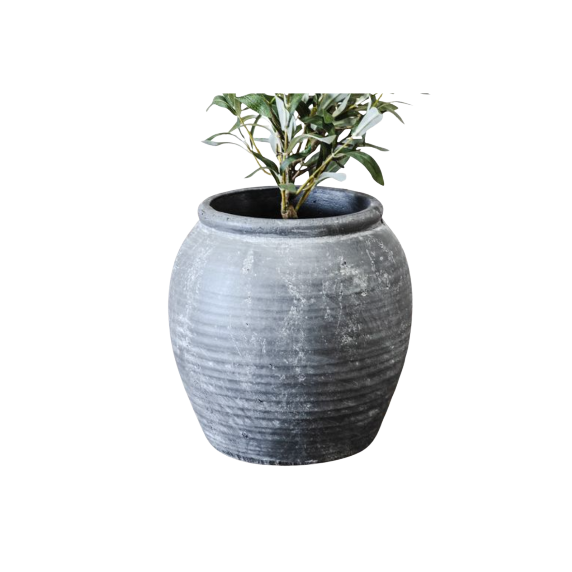 Sleek ceramic vessel featuring a 12-inch diameter with artfully applied black linear detailing that creates visual depth and contemporary appeal. The distressed finish adds character and sophistication, making it an ideal choice for displaying plants in modern interiors or botanical collections.