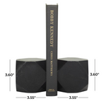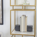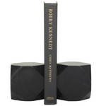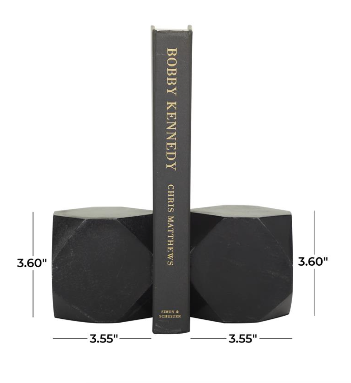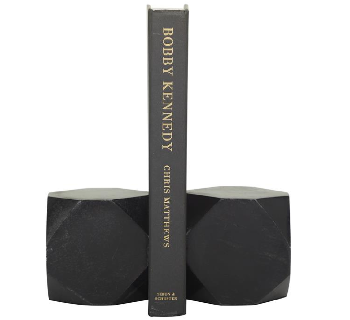 Faceted marble bookends feature a geometric silhouette and a design that takes inspiration from a rock.