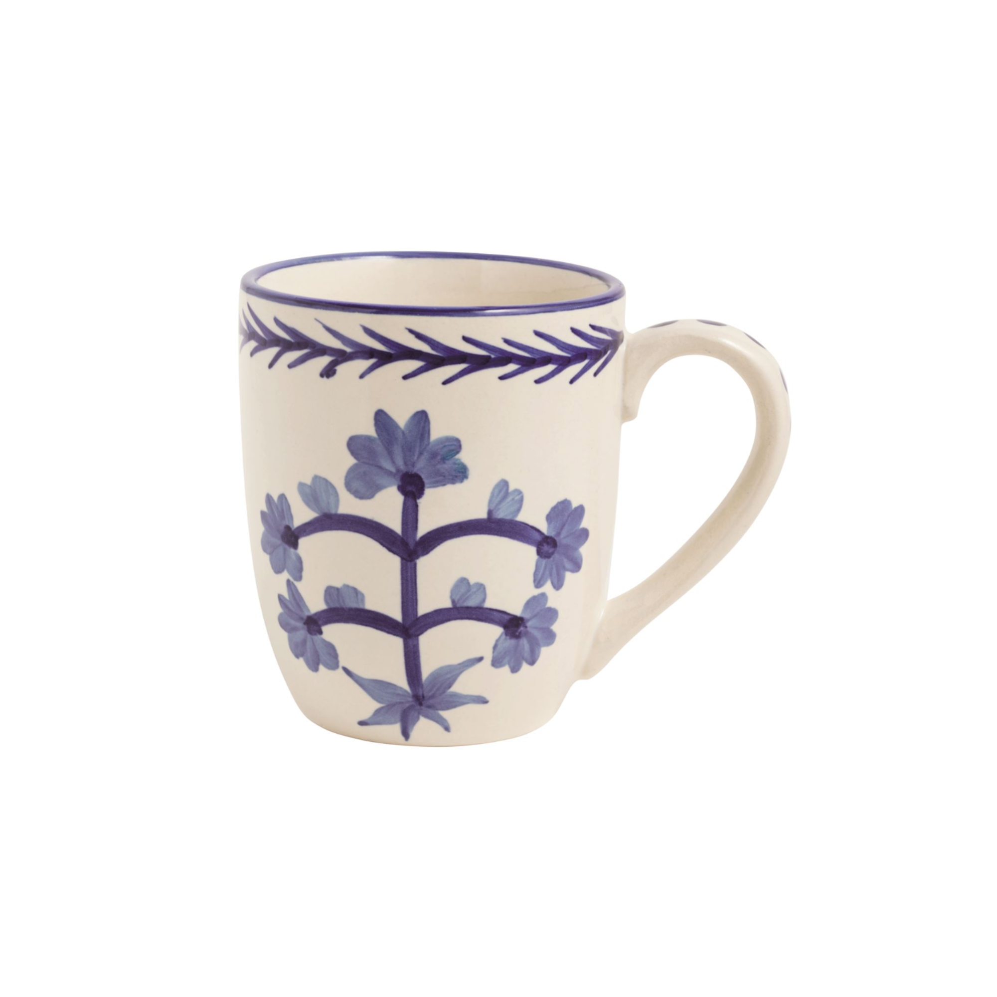 Artisanal ceramic mug featuring hand-painted white and blue detailing. Each piece showcases individual brushwork, making it a distinctive addition to any tableware collection. The durable ceramic construction ensures reliable daily use while the sophisticated color palette complements modern and traditional interiors alike.