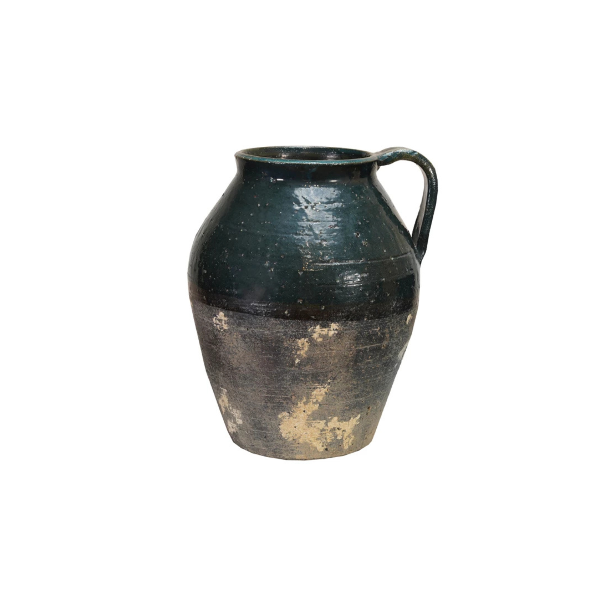 This terra-cotta pitcher showcases an artisanal distressed finish with reactive glaze detailing in striking blue tones. Measuring 9-1/2"L x 9-1/4"W x 11-1/4"H, each piece is individually crafted, ensuring unique variations in color and texture. The weathered aesthetic brings authentic character to any interior space, whether displayed as a standalone accent or styled with botanicals. Perfect for collectors seeking handcrafted decorative vessels with genuine depth and visual interest.