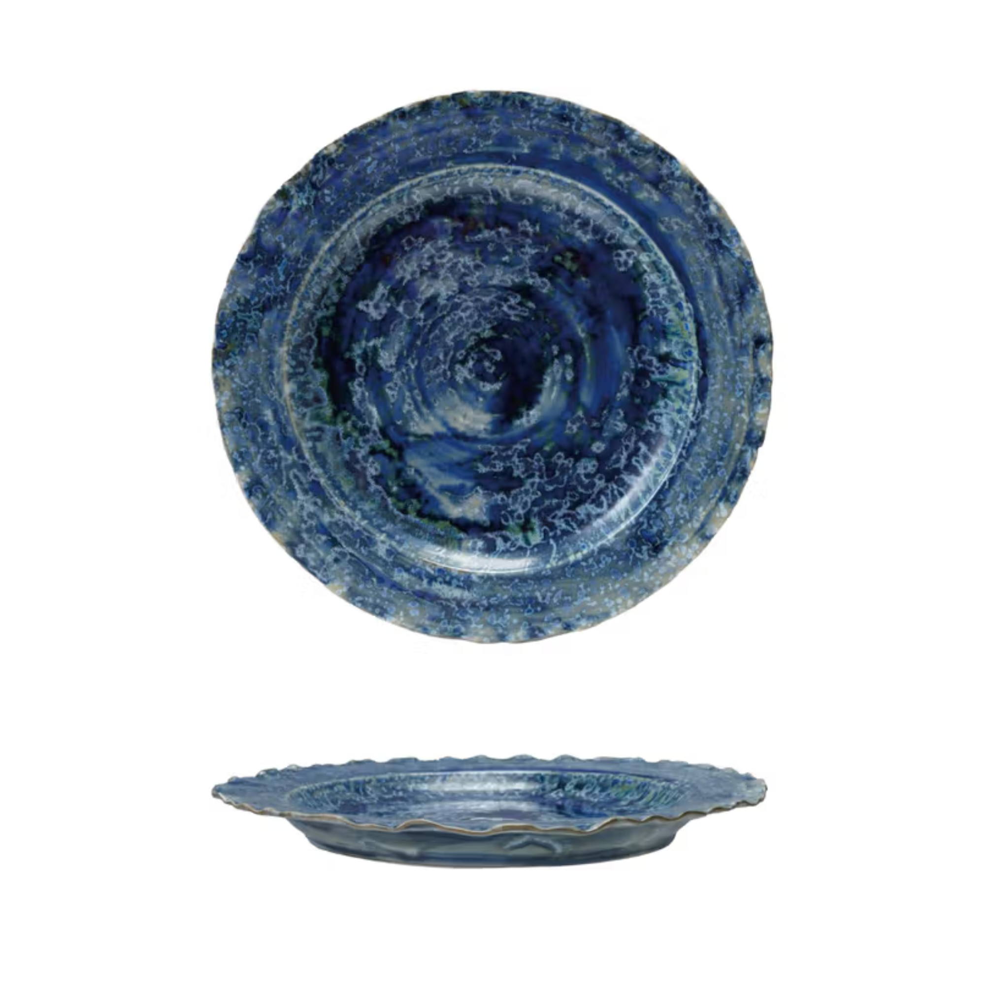 Handcrafted stoneware plate featuring an organic, irregular rim and reactive crackle glaze finish in rich blue tones. Each 11-1/4" piece is individually unique, showcasing natural variations in the glaze application. The textured surface and artisanal quality make it ideal for both everyday dining and special occasions, adding distinctive character to any table setting.