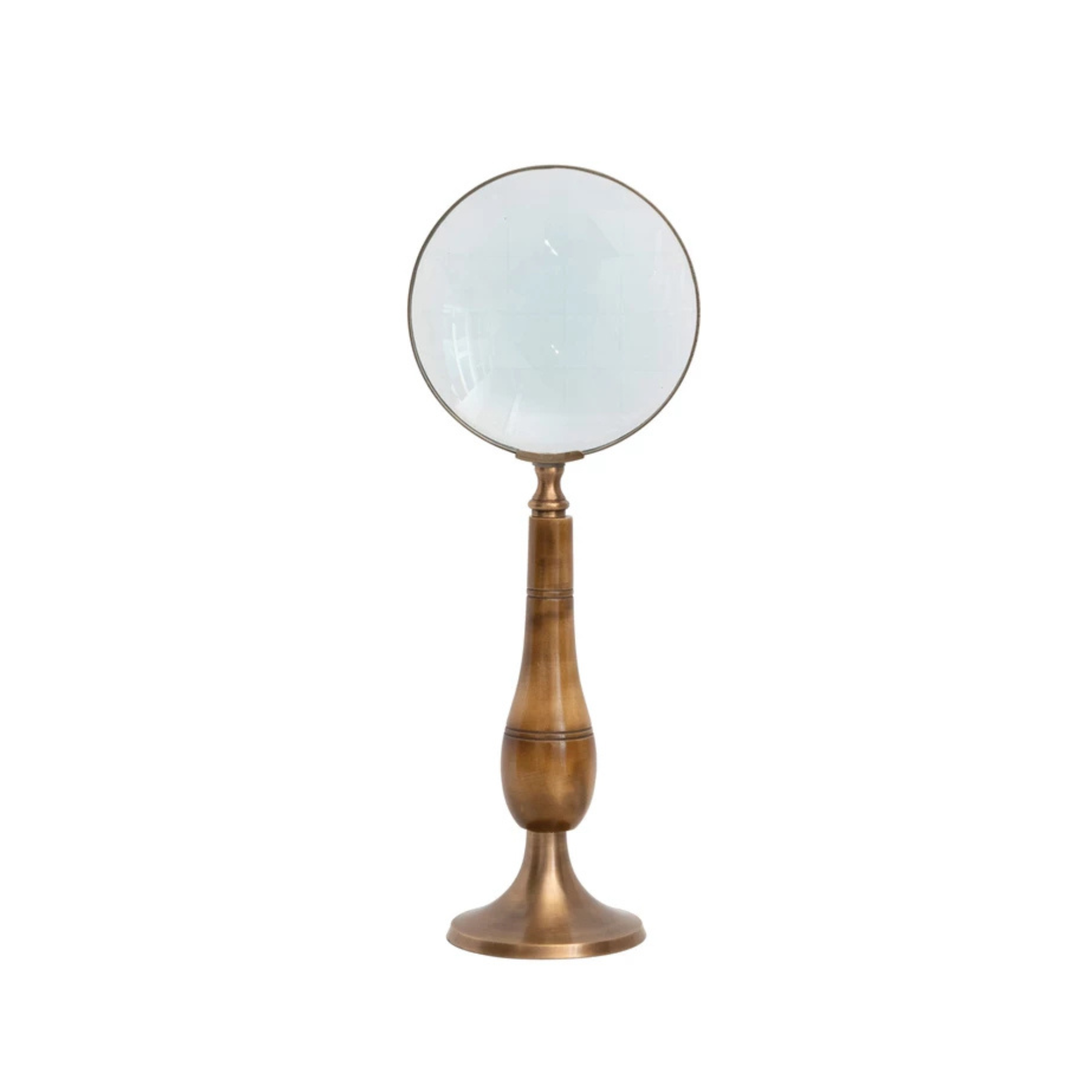 This vintage-inspired magnifying glass showcases a carved bone handle and brass accents, accompanied by a matching stand.