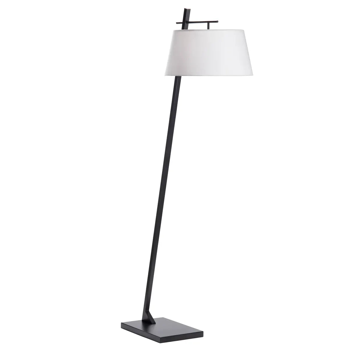 This Floor Lamp is 68.5-inches high and has been styled from black metal. The design extends from a solid metal base and is balanced with a diagonal pole that extends the white, tapered, linen shade over the space you need lit -- a great option when you do not want a side table but lighting is needed over a sitting area. With the floor lamp's linear design, it will compliment a room that is decorated with a black and white theme in your modern style home or office decor.