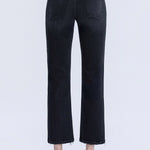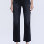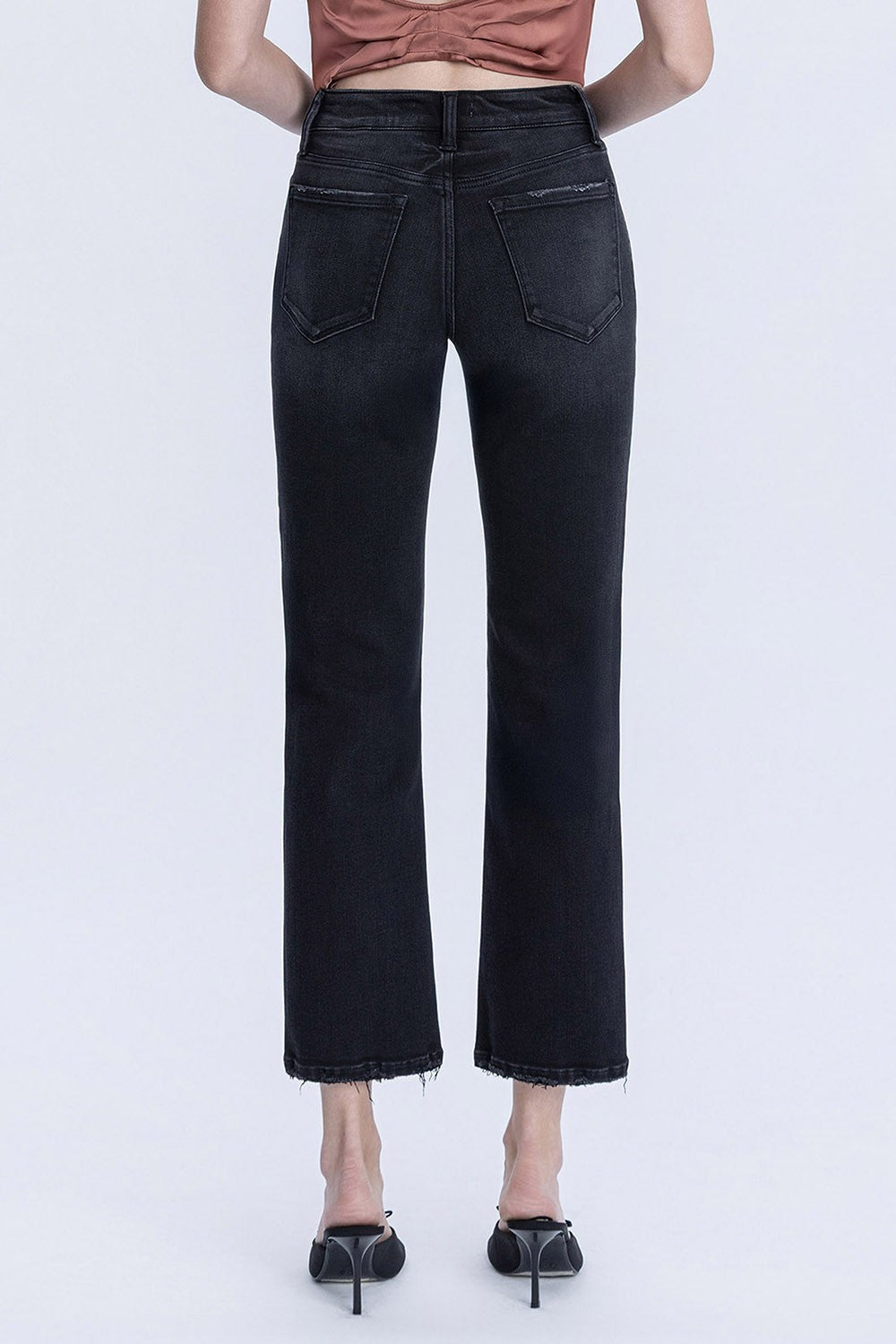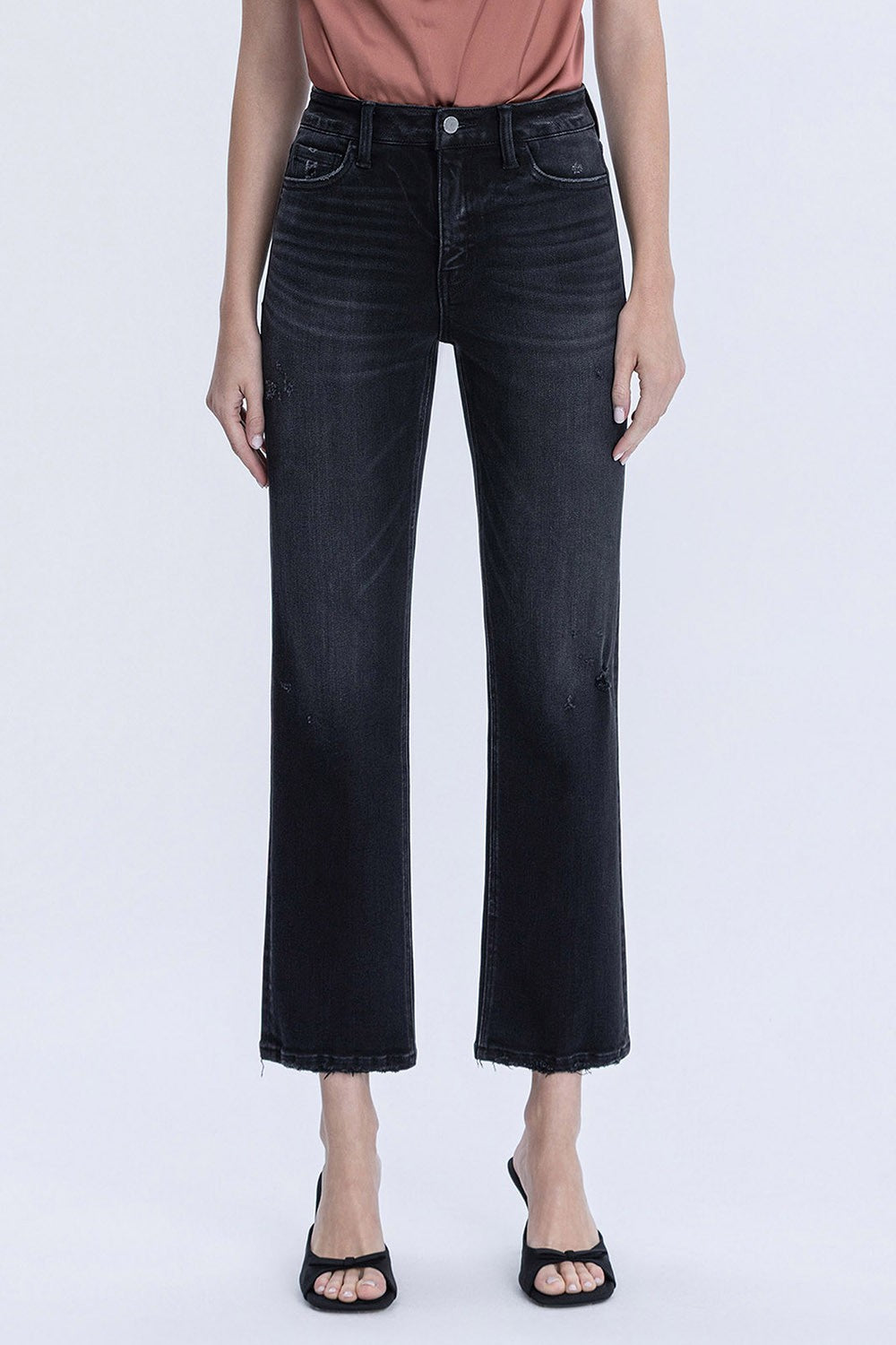 These mid-rise black straight jeans feature a comfortable stretch denim fabric with a mid-rise waist and five pockets. Designed with lightly distressed accents, they offer ankle-length coverage for a modern, tailored look.