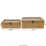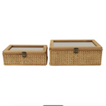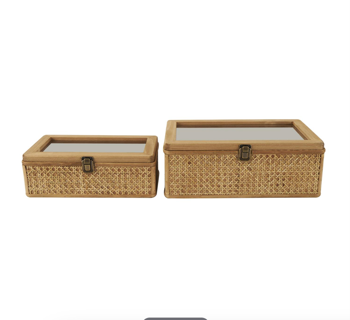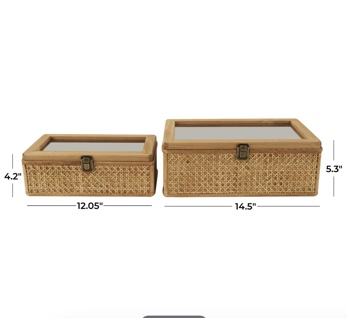 Infuse your home with cozy charm, where organic materials and warm earthy tones create a timeless, nature inspired atmosphere. Made from high-quality rattan, wood, Miff, and glass, these boxes offer both durability and a natural aesthetic. Natural rattan box set has clear glass tops and features a warm brown color and bronze latches, adding an earthy touch to your decor.