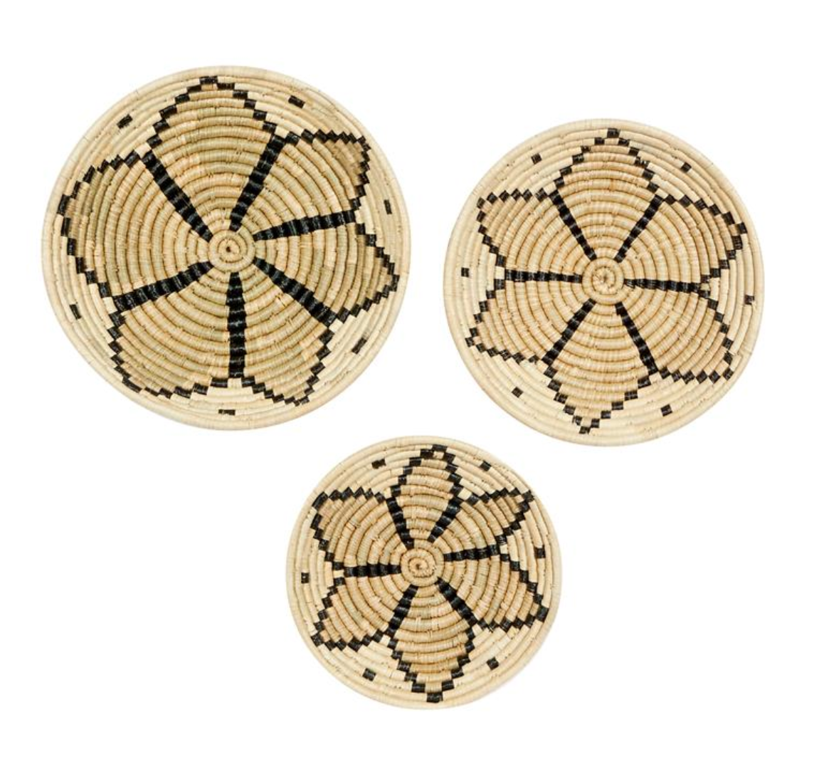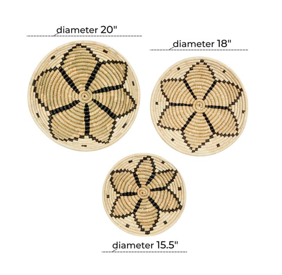 Designed with a free-spirited charm where vibrant hues, eye-catching patterns, and whimsical accents transform your space and showcase your personality. Brown round seagrass decoration set is crafted of lasting dried plant material. Black plastic strips are threaded in a starburst pattern over the coiled brown seagrass strips. Each wall art showcases black plastic strips threaded in a floral pattern over the coiled seagrass structure