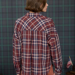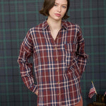 This burgundy plaid top features a collared neckline, long sleeves with a relaxed drop shoulder design, a button-down front, and a flap pocket detail, combining classic elements with subtle modern touches.