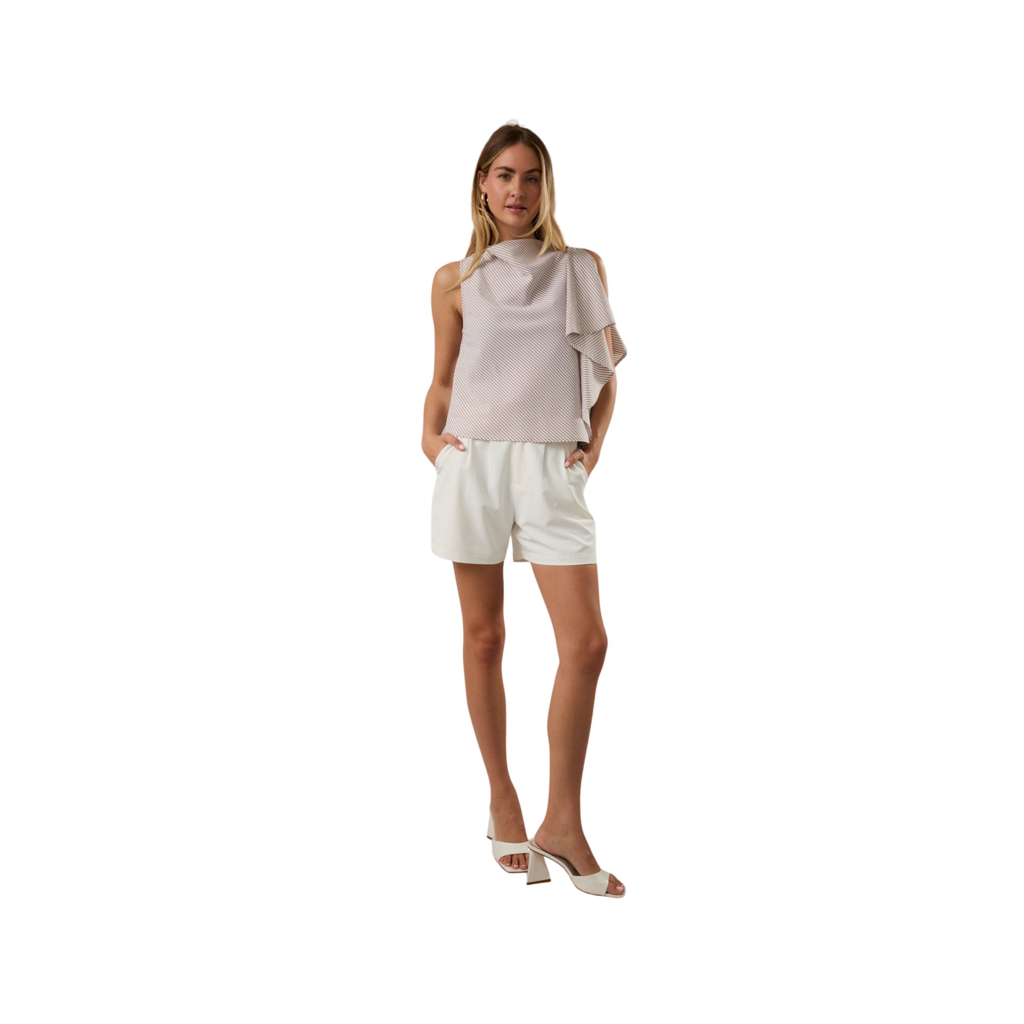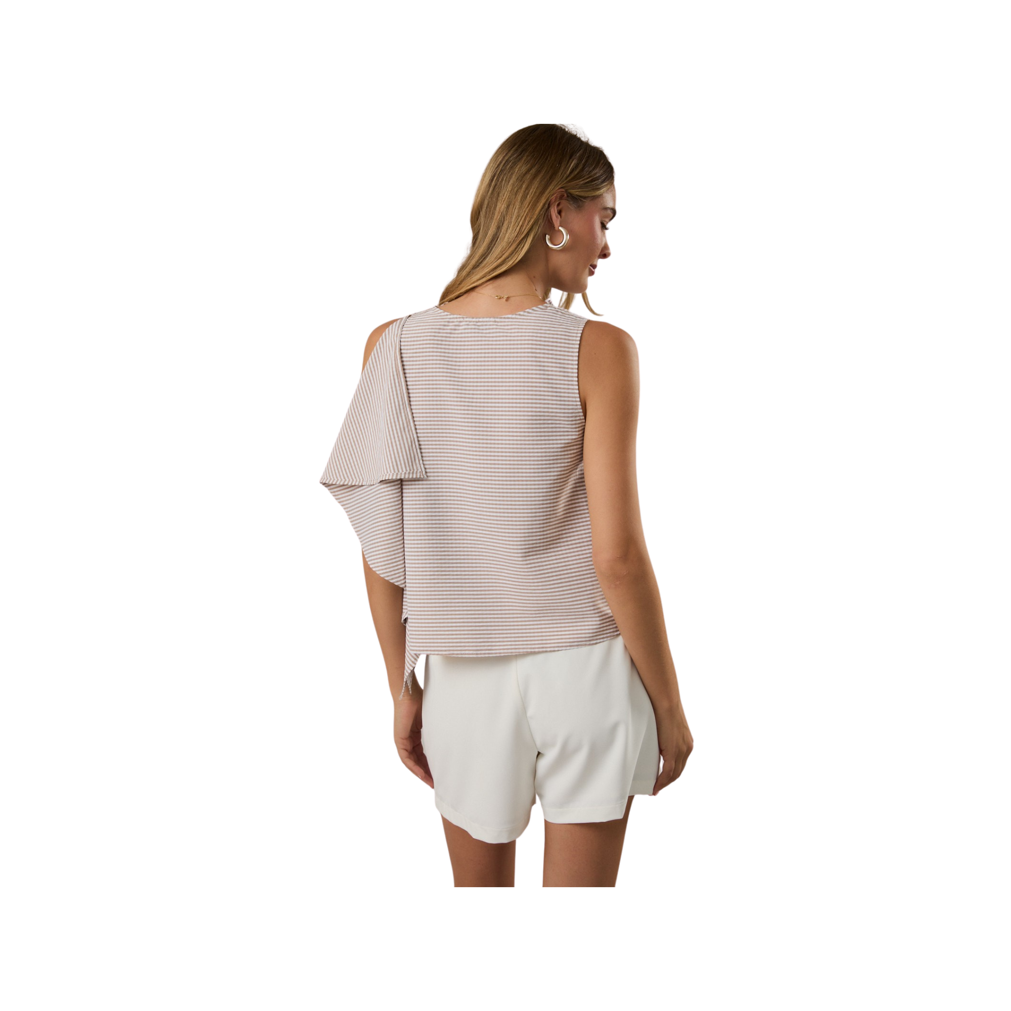 Crafted in a refined tan and white striped pattern, this asymmetrical top delivers effortless sophistication through its lightweight construction and thoughtfully designed silhouette. The off-balance neckline and hemline create visual interest while maintaining the versatility to transition seamlessly from casual to polished occasions.