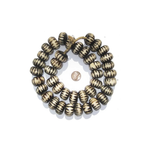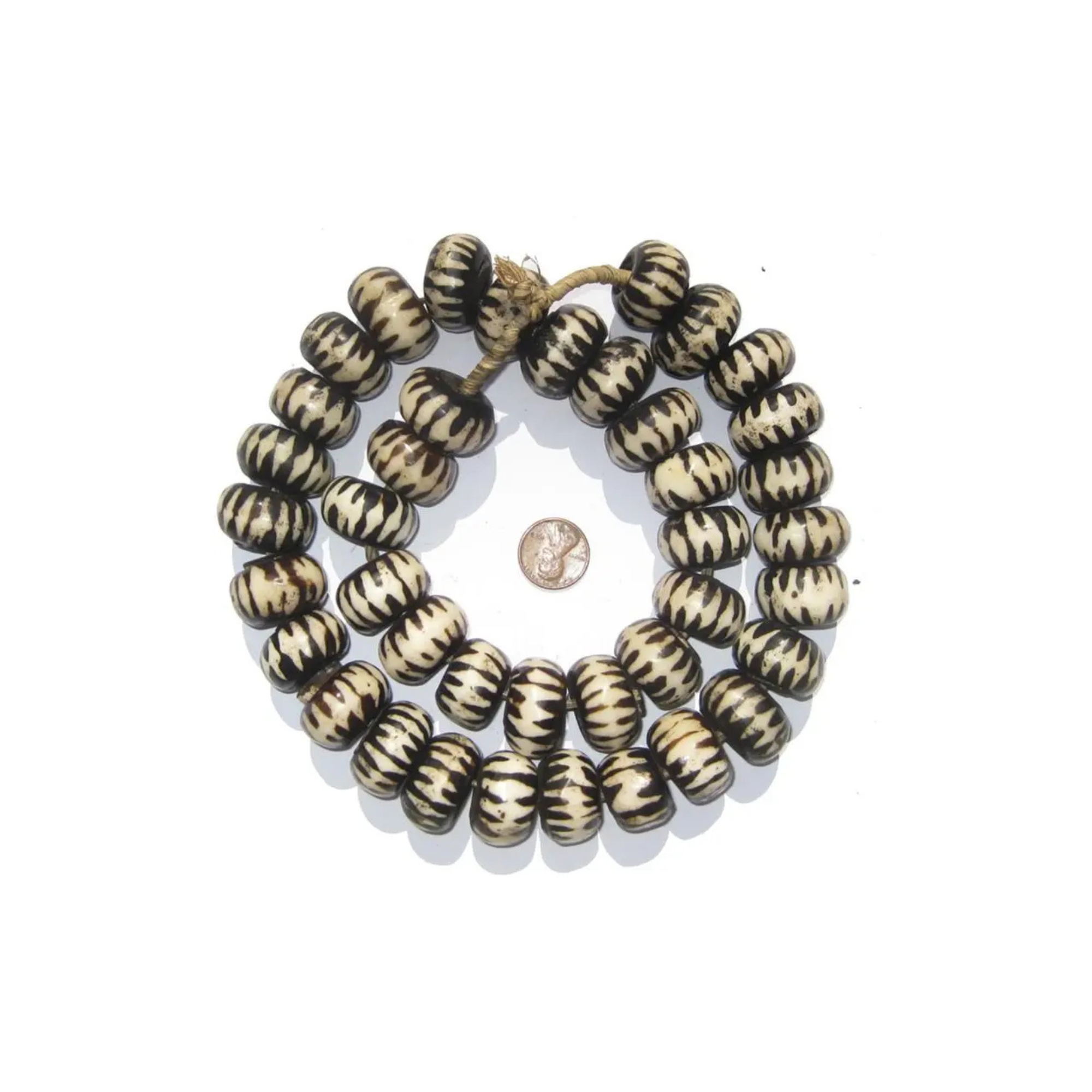 These striking chevron beads showcase the traditional batik wax-resist dyeing technique, creating a distinctive geometric pattern that wraps completely around each bead.