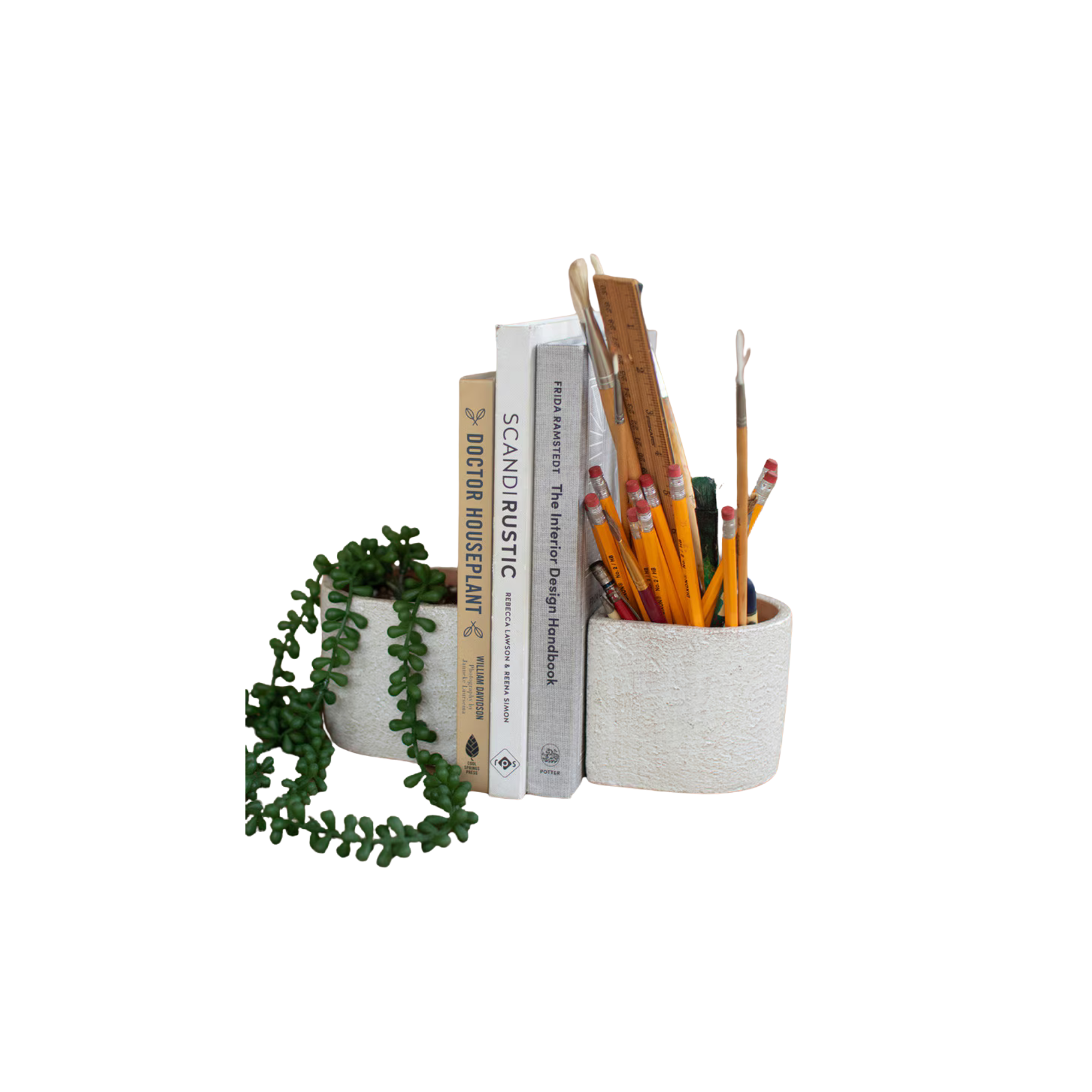Keep your books organized and add greenery to your shelves with this versatile set of two concrete bookend planters. Crafted in clean white, each piece features a planter opening perfect for artificial or fresh flowers. Measuring 4.5" x 4.5" x 4" tall, these sturdy bookends combine functional storage with decorative appeal for any room.