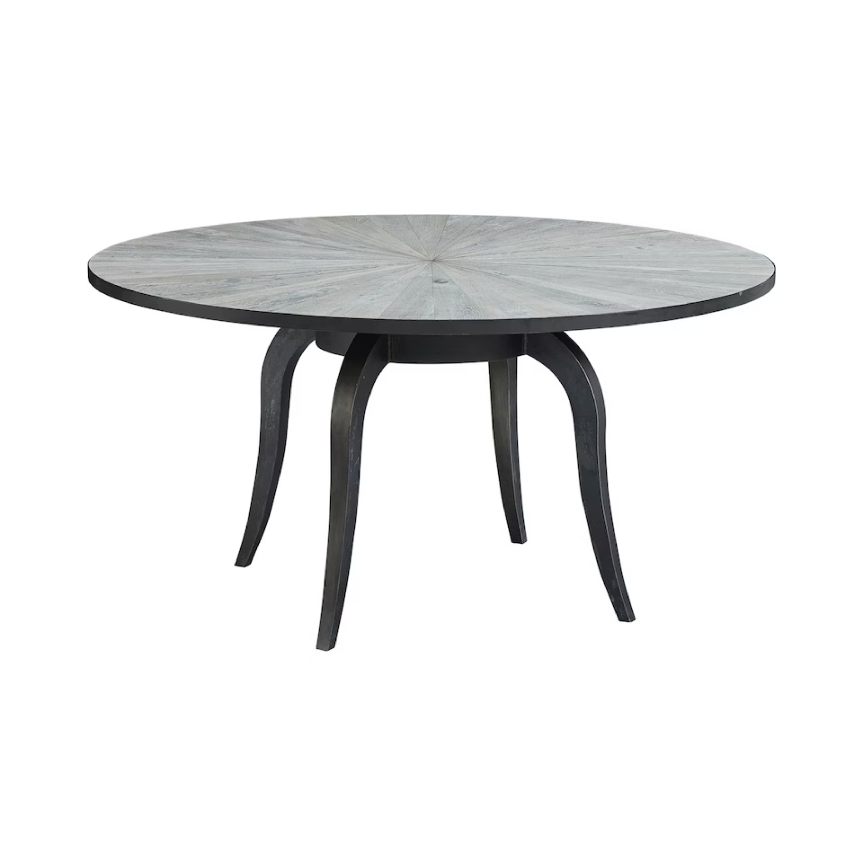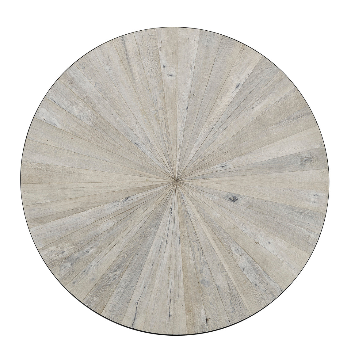 Reclaimed oak in a sunburst design, in a white washed finish that contrasts beautifully with the dark iron banding and base. Table base features slightly splayed iron cabriole legs and pairs beautifully with our matching Demeter Sideboard.
