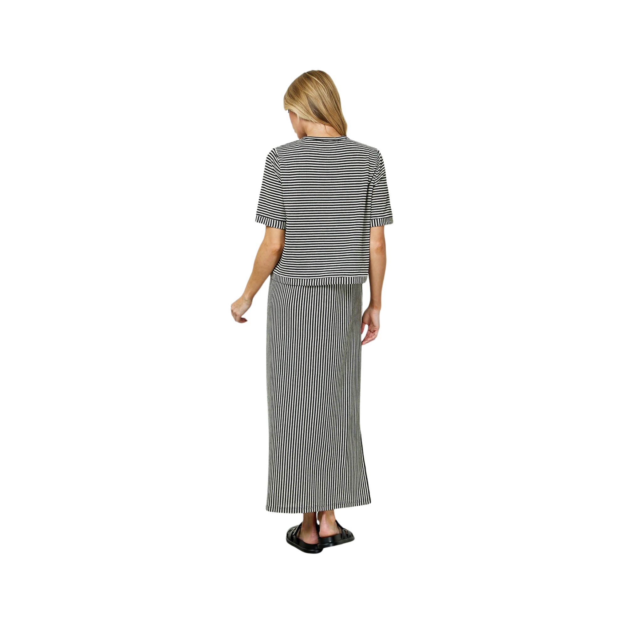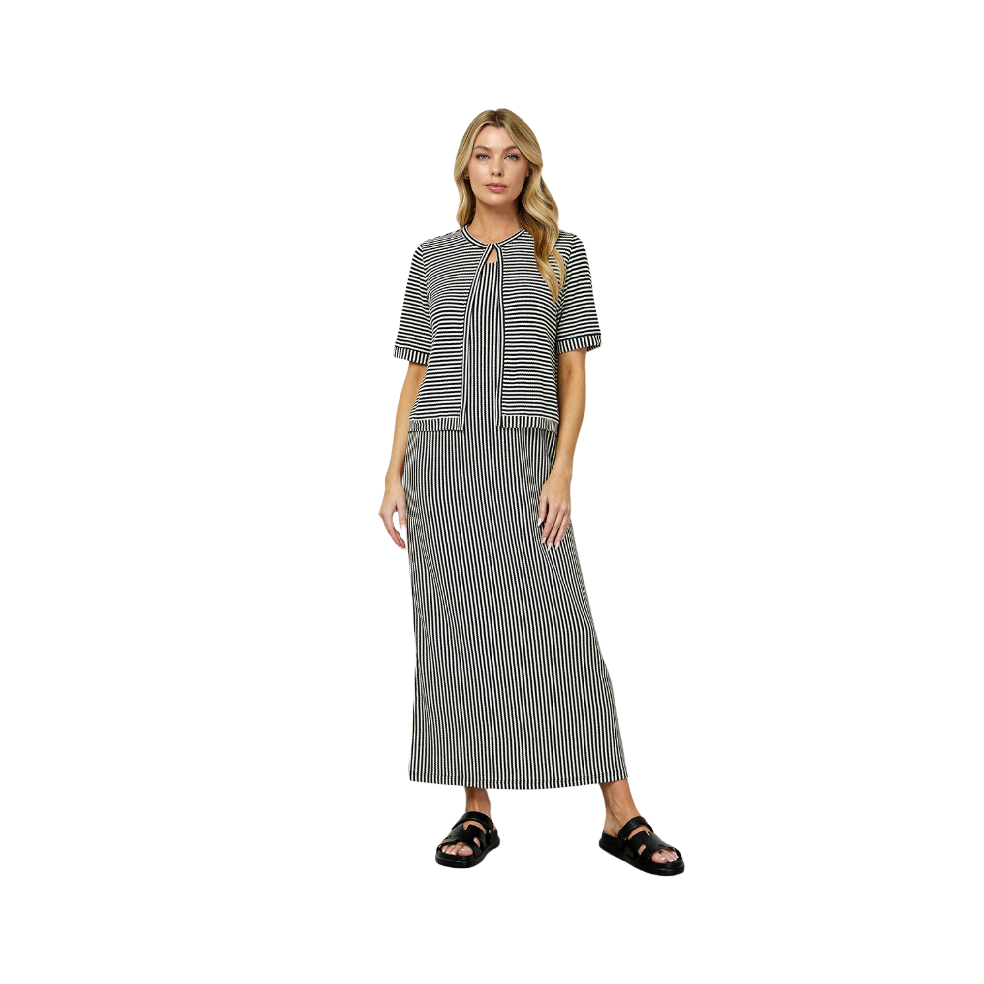 This elegant striped midi dress features a modern layered illusion with a contrast stripe direction for a refined yet effortless look. Designed with a relaxed silhouette, short sleeves, and a subtle keyhole neckline, it offers both comfort and sophistication. The vertical stripe skirt elongates the figure, while the horizontal stripe top adds visual interest and balance. Perfect for day-to-night wear, this dress transitions seamlessly from casual outings to polished occasions.