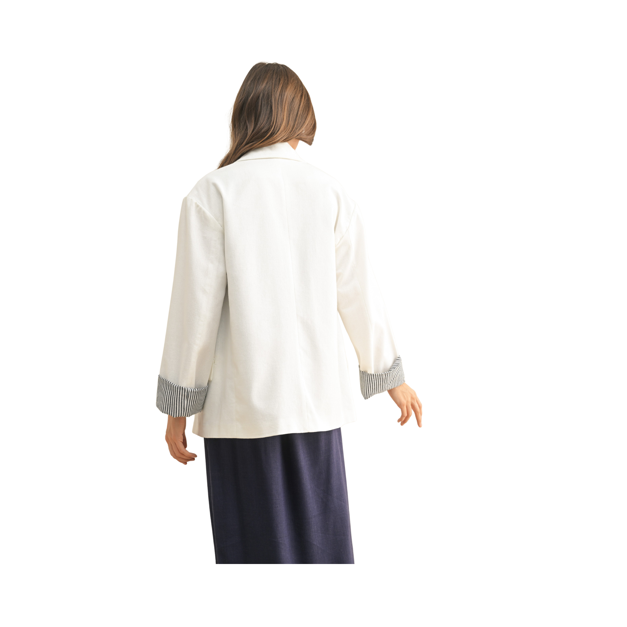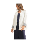 Crafted from luxurious rayon, this refined blazer features a crisp white foundation elevated by striking navy striped detailing along the sleeves. A sophisticated layering piece that transitions seamlessly from office to evening occasions.
