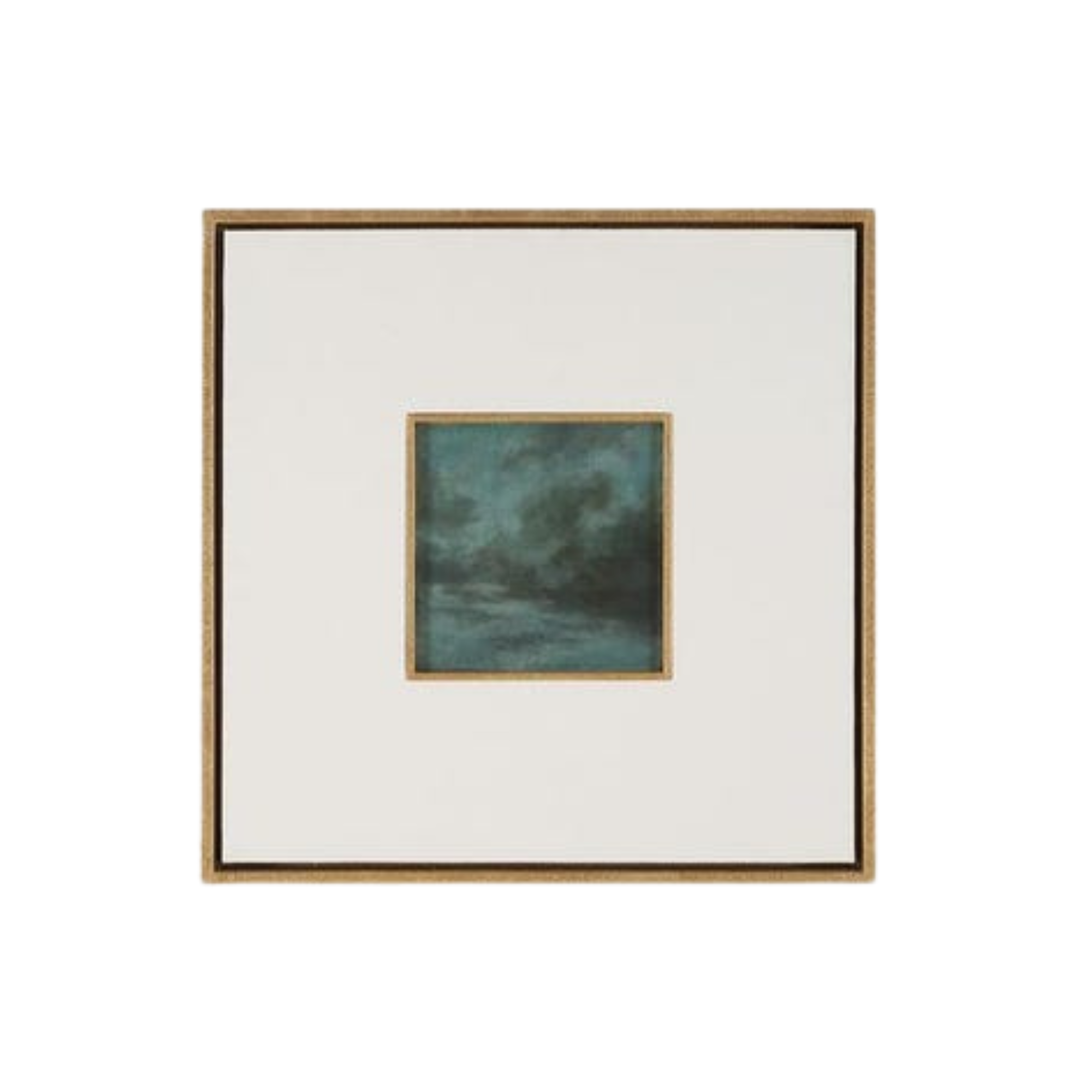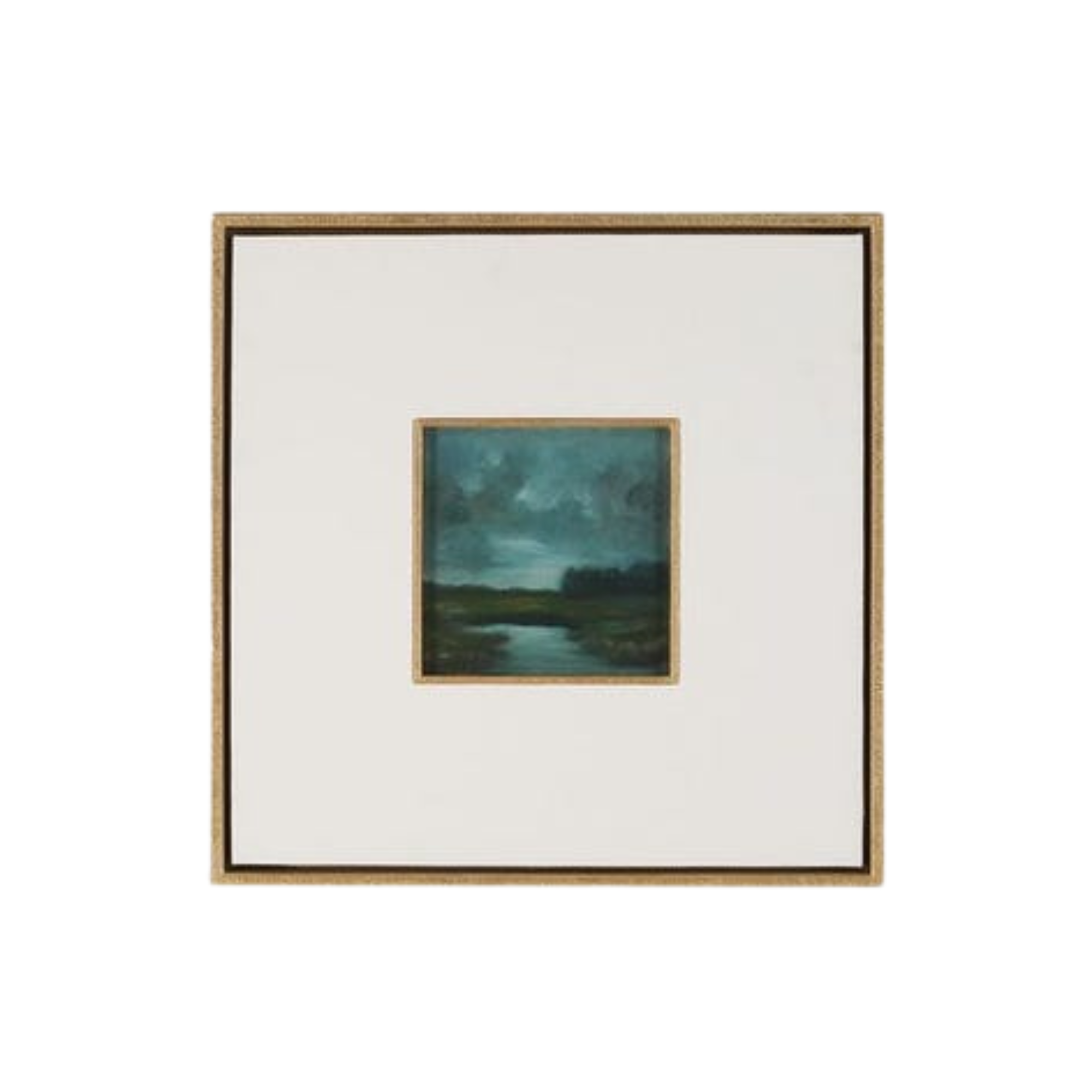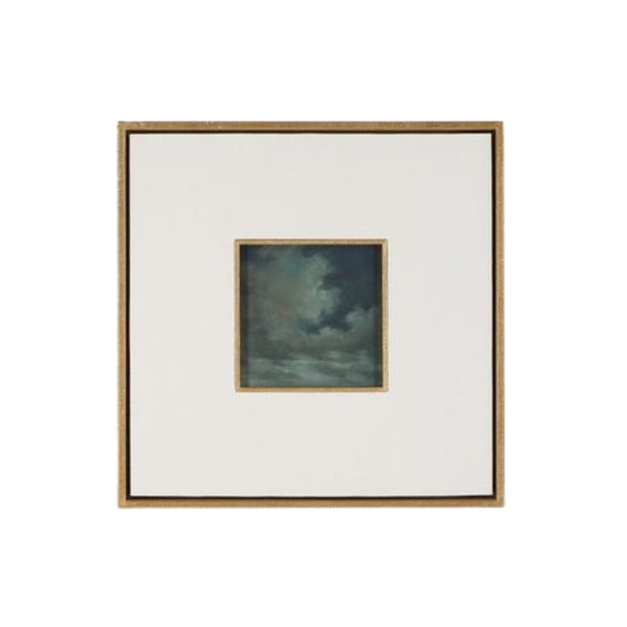 Each piece is framed with a carved golden surround, a 6.5" white linen matte, then a floating box frame in an antique gold leaf finish that replicates the carved surround. They are sold separately.