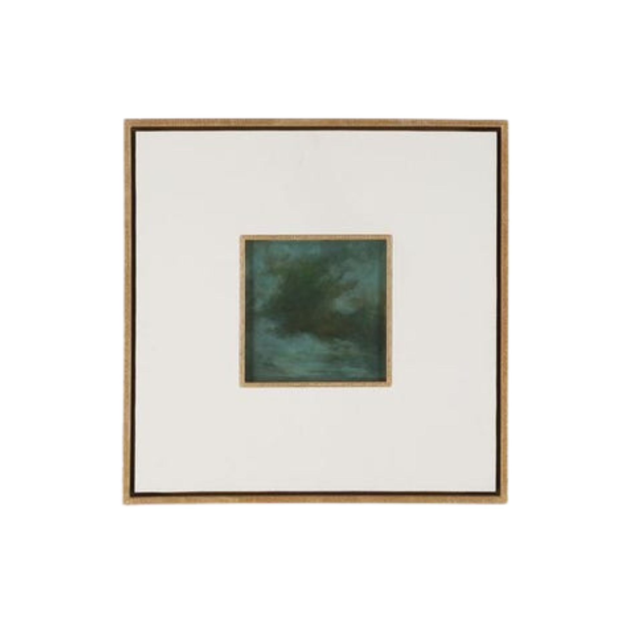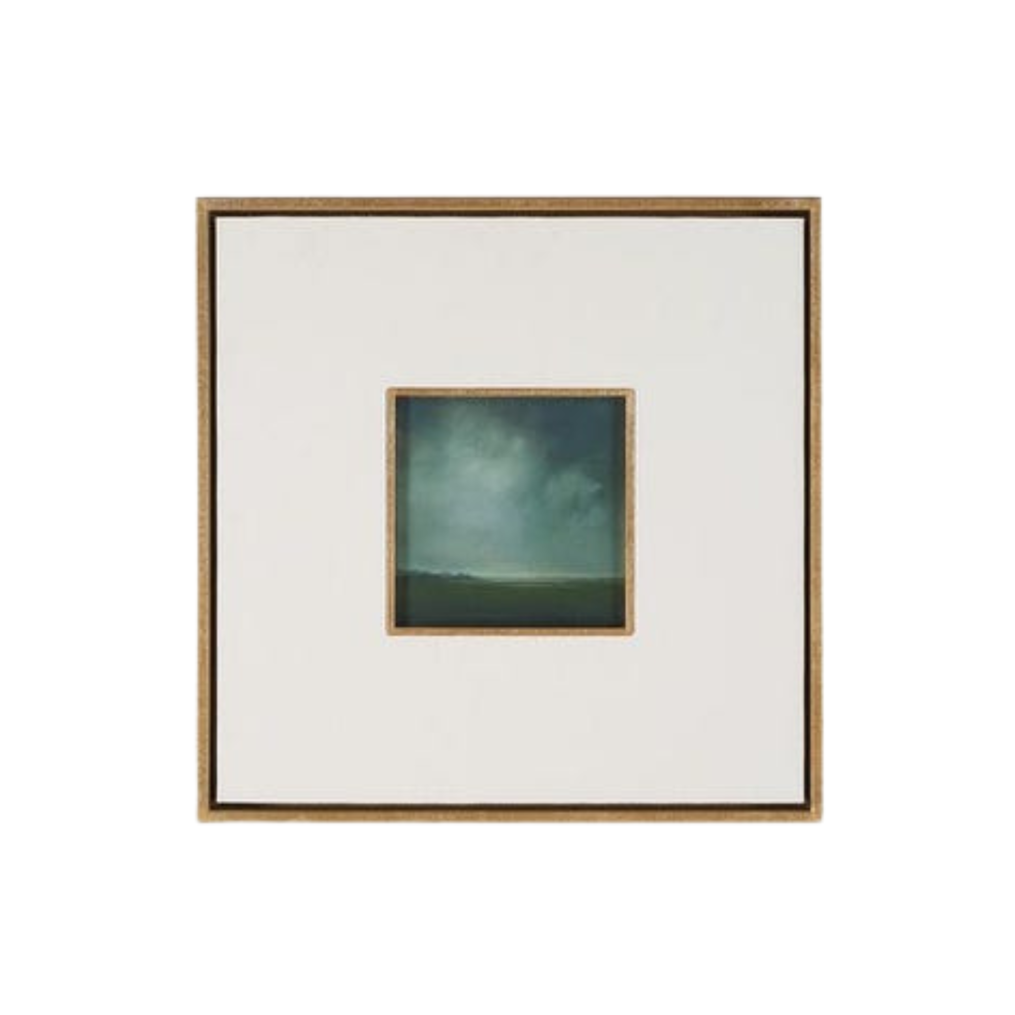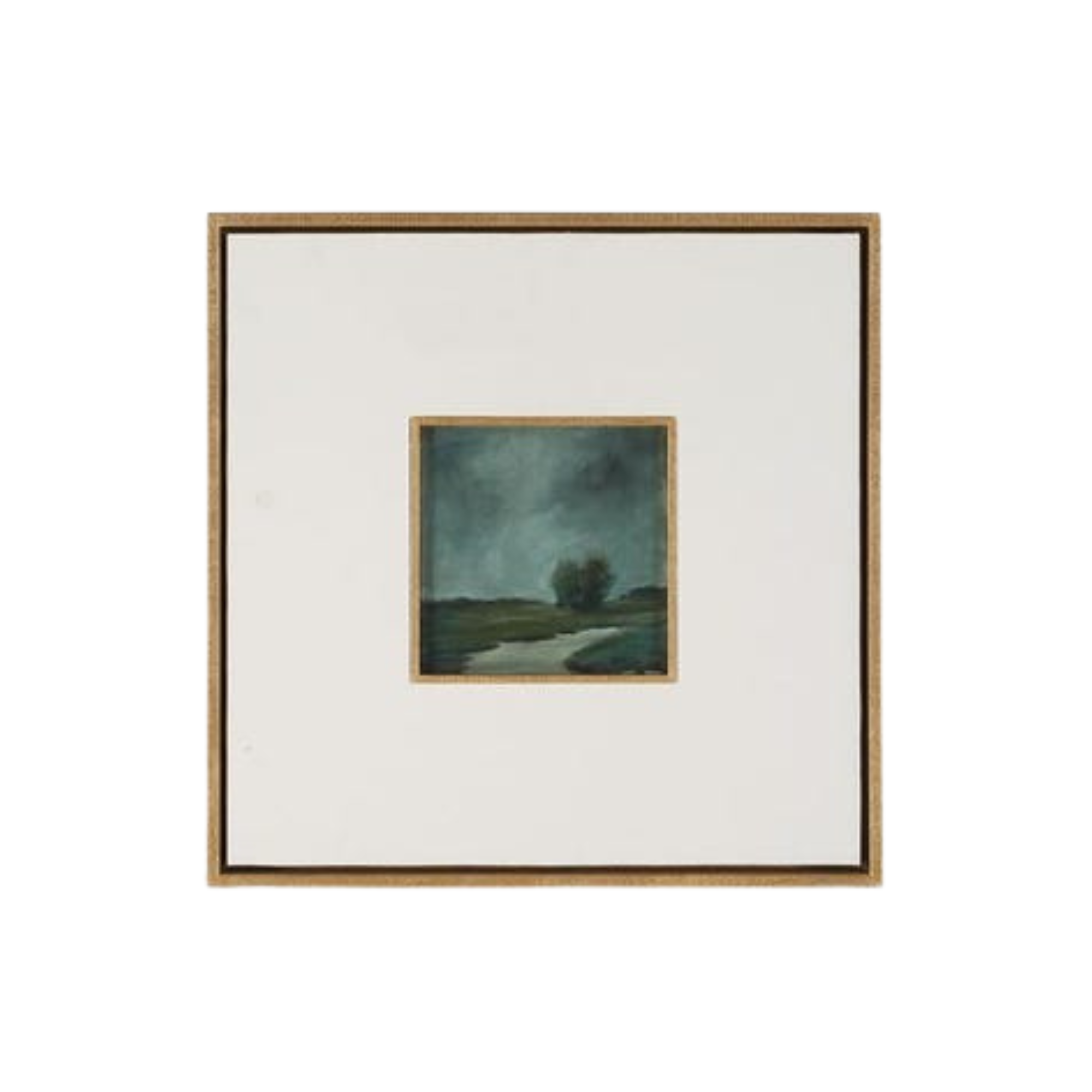 Each piece is framed with a carved golden surround, a 6.5" white linen matte, then a floating box frame in an antique gold leaf finish that replicates the carved surround. They are sold separately.
