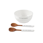 3-piece set. Fluted ceramic salad bowl with beaded rim features notches to hold included wooden serving spoons with ceramic handles.