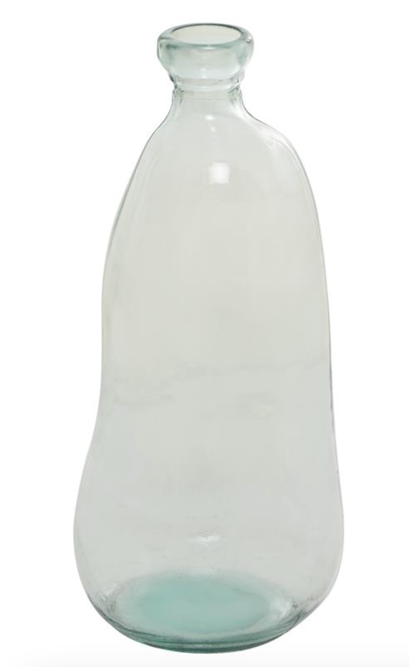 This coastal glass vase features a cylinder bottle shape and a transparent glass exterior