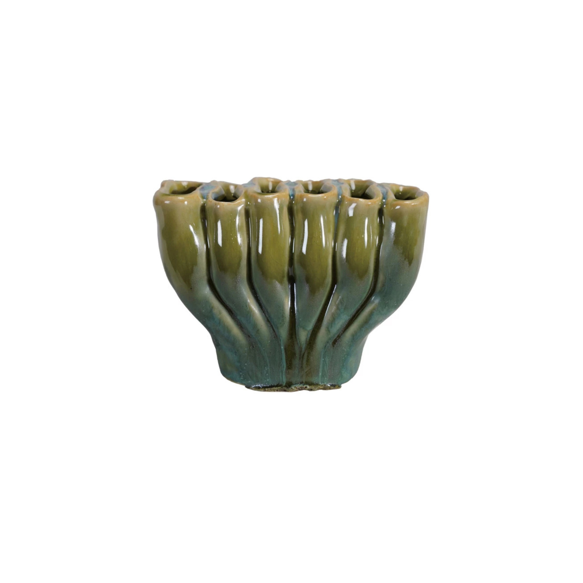This handcrafted stoneware vase showcases organic sculptural design with six distinct sections, each finished in a reactive glaze that creates subtle variations in tone and depth. Measuring 4-1/4" long by 2-1/2" wide by 3" high, it's an ideal accent piece for shelving or tabletop displays. The reactive glaze technique ensures every piece is uniquely finished, making each vase a one-of-a-kind addition to your collection.