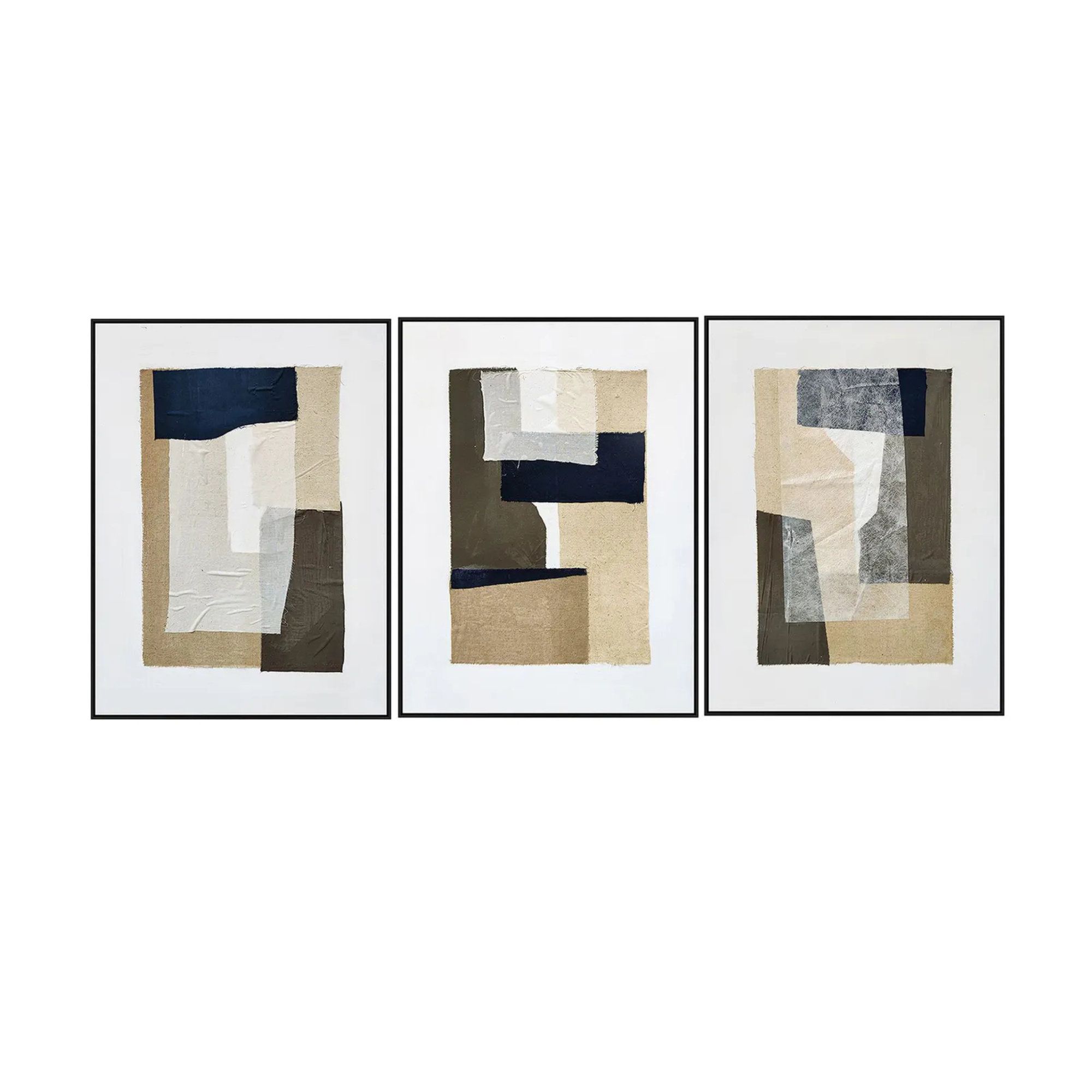 Each 24x32" piece in this set features an intricate layering of delicate linen fabric, hand-painted in a warm and harmonious color palette of brown, tan, and black. The overlapping fabric strips are arranged in an entrancing color-block pattern that transitions seamlessly into an abstract work of art.. Arrange the trio with the included D-ring brackets for a coordinated gallery-style display, or separate them to bring a hint of warmth to multiple rooms.