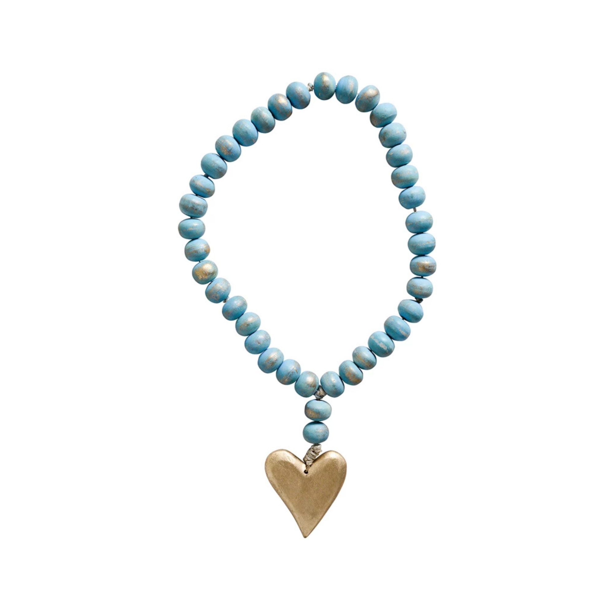 This large decorator piece has a gold heart hanging from a chain of mango wood beads. The beads are aqua with gold distressing throughout.