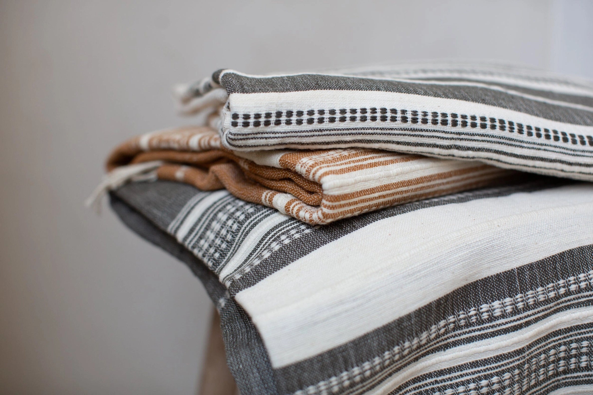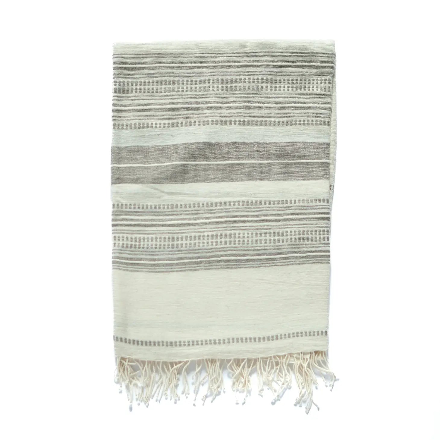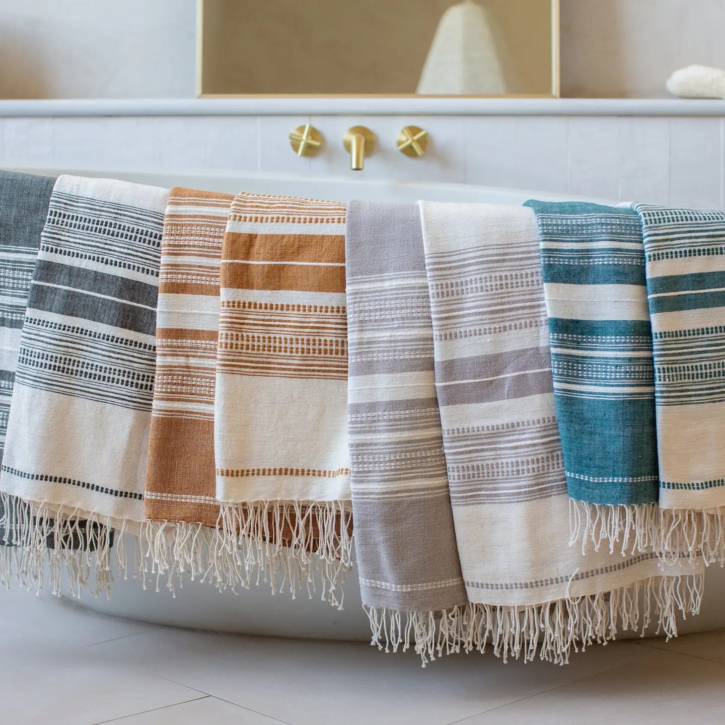 These Fair Trade, eco friendly, handmade towels are adorned with Ethiopian traditional patterns. These beautifully intricate towels are very versatile and can easily be used as throws, picnic blankets, bath towels, sauna towels and even shawls. They are perfect to take on the airplane and wrap up in when wanting a bit of shut eye. This collection is made of hand spun cotton and woven on a traditional hand loom. These bath towels go together with the Genale hand towel and bath mat. They are finished with hand twisted fringes. They are machine washable, durable, absorbent and quick to dry. The collection is named after a river that runs through southeast Ethiopia.