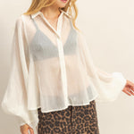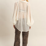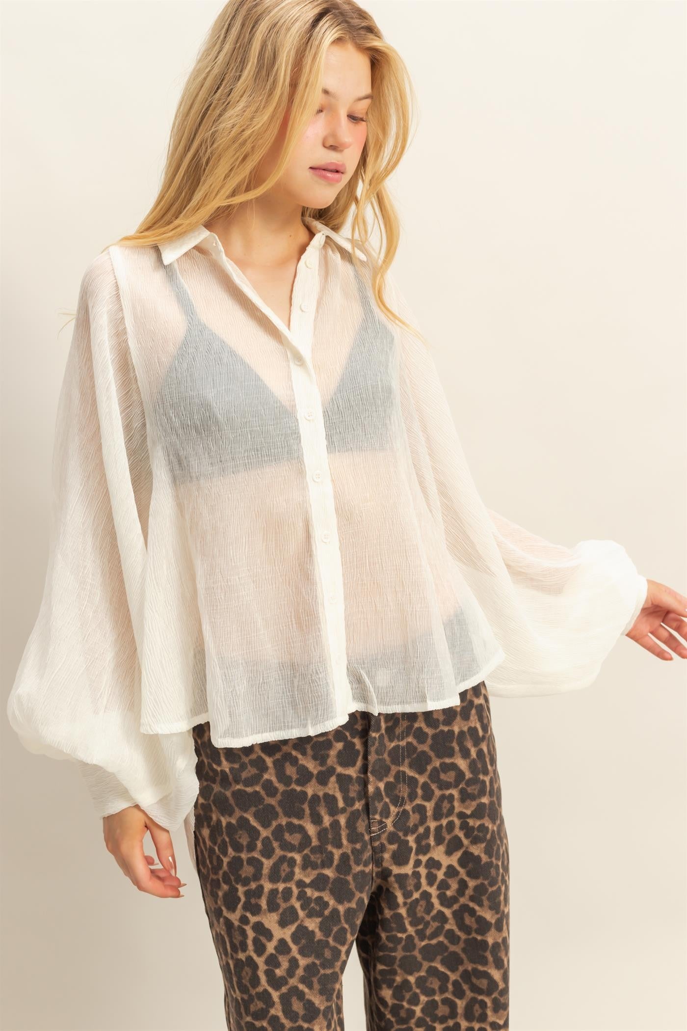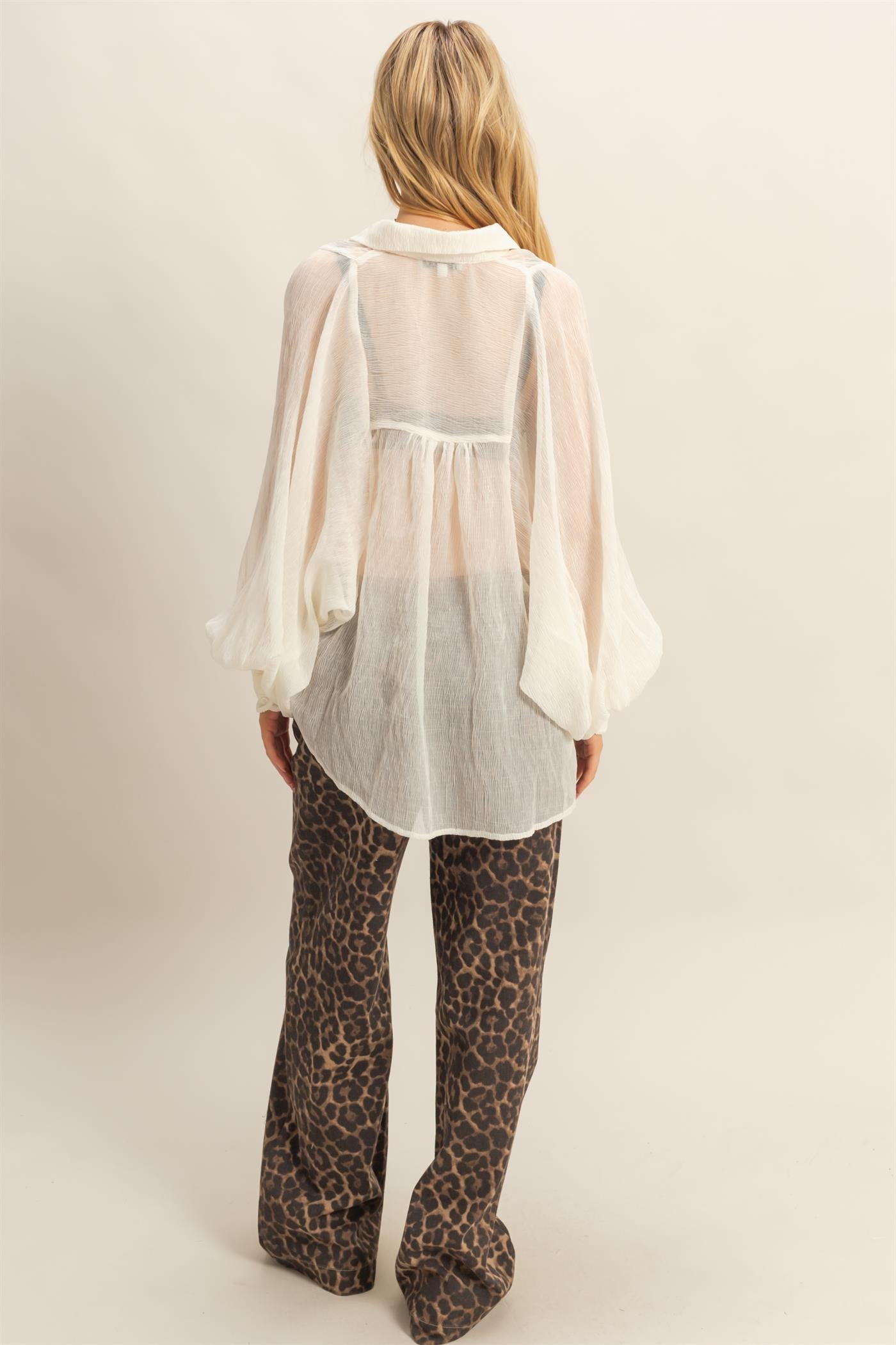 This textured button-down shirt captures relaxed sophistication through its effortlessly elegant shape. Designed with a delicate sheen, it offers a comfortable, loose fit that balances casual ease with polished style. The extended cuffs, structured collar, and complete button front contribute to its refined aesthetic, establishing it as a versatile staple for any closet.