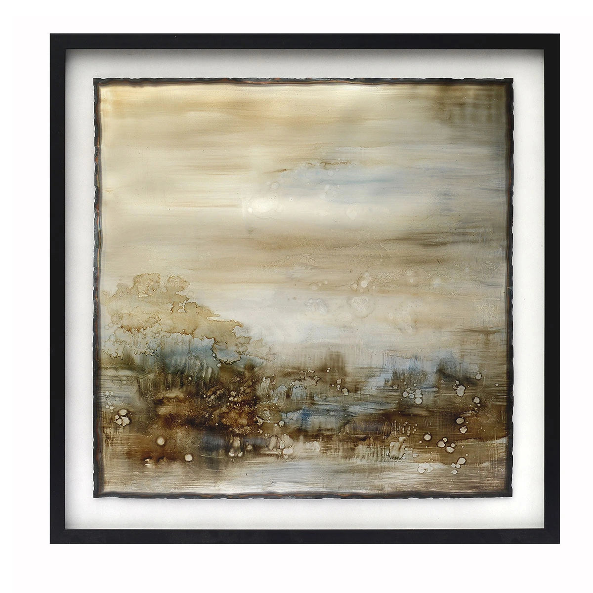 THe Hazel Days art piece will complement your contemporary decor style. Hues of brown, grey, and white blend together to create an abstract image on tin. The natural colored mat and black frame pair beautifully with the artwork. This image measures 34-inches x 34-inches square and can be hung with the two included D-ring hardware pieces.