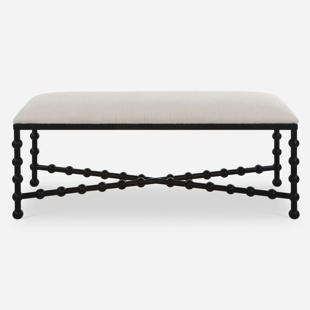 Sophisticated style created by the whimsical bubble legs ensures this bench to stand out in any home. Crafted in iron with a satin black finish contrasted with a cushioned seat in a crisp white textured polyester fabric with performance treatment.