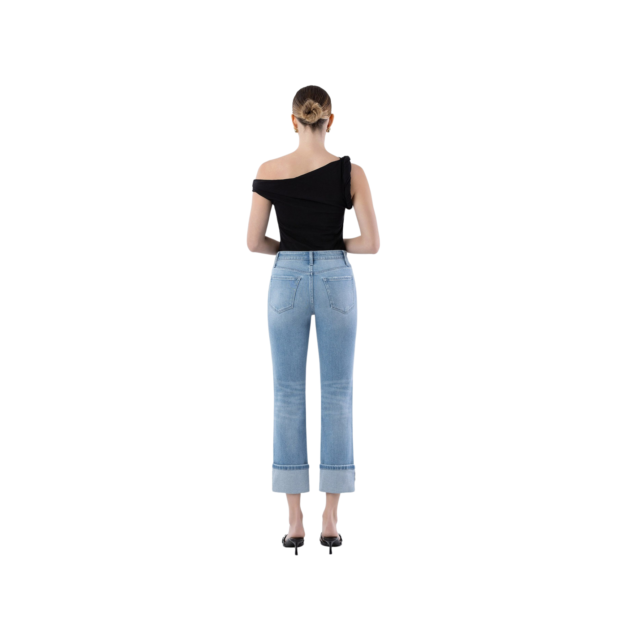Crafted from comfort stretch denim, these high-rise slim straight jeans deliver a refined silhouette with modern versatility. The cropped length and single cuff hem create a polished finish, while the five-pocket construction ensures practical everyday wear. Medium light wash denim provides a timeless aesthetic that pairs effortlessly with any wardrobe. Designed for those who appreciate quality construction and contemporary styling.
