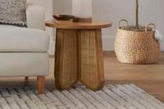 This side table is constructed, using tongue and group joint methods, of mango timber in a water resistant lacquer sealed natural finish. This table features a pedestal style support system of intersecting shaped panels with cane inserts. The cane is locally sourced in Eastern India.