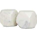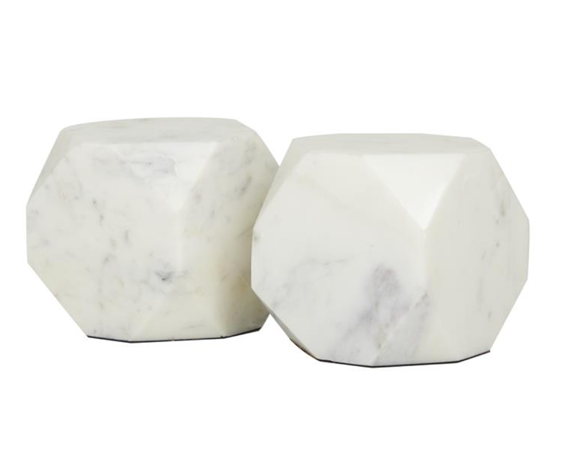 Faceted bookends feature a geometric silhouette and a design that takes inspiration from a rock