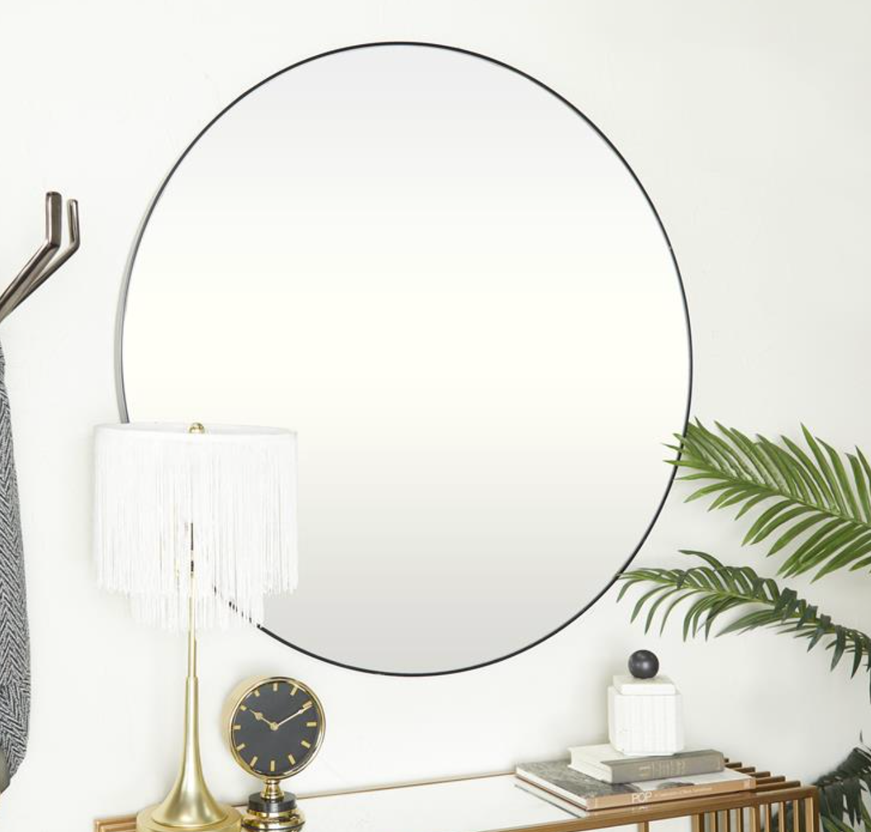This round hanging wall mirror comes with a thin black frame and a matte wood finish for a minimalistic design. Sleek round shape complements the reflective finish of this wood wall mirror for a structured overall design that adds depth to the walls.