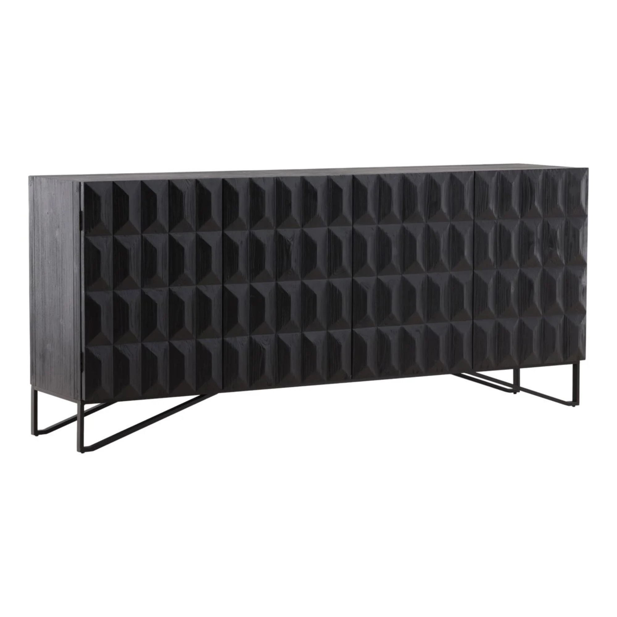 Bring contemporary style to your living space with this 84” sideboard. This versatile sideboard mixes materials and textures to create a striking design. Made from reclaimed pine wood in an edgy antique black finish. Featuring a stunning hand-carved design on each of the four doors that open to find two built-in shelves for added storage. Sitting atop a black metal base for extra support, this sideboard is equal parts durable, functional, and stylish.