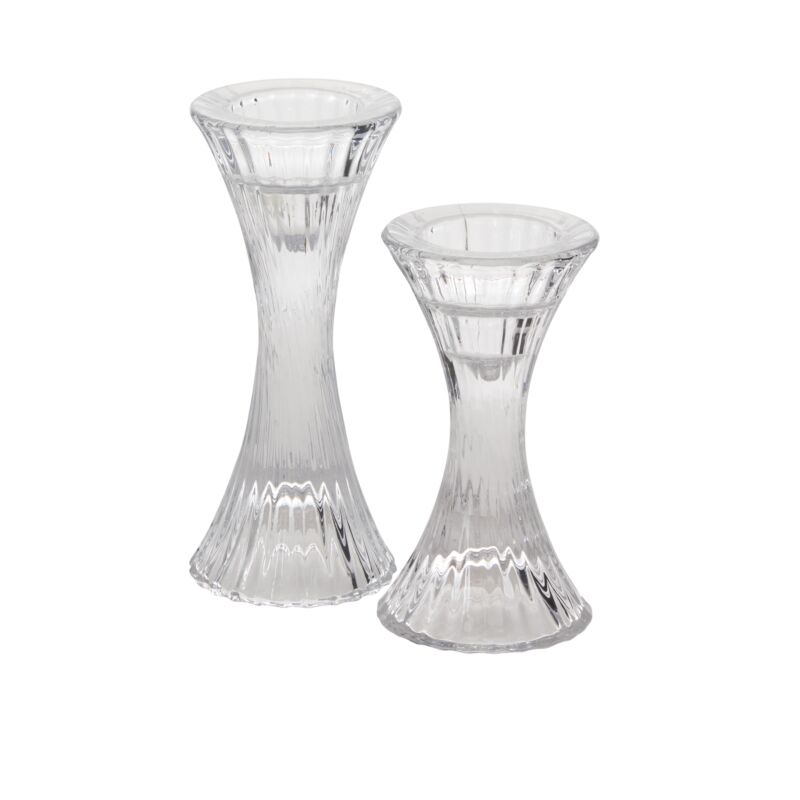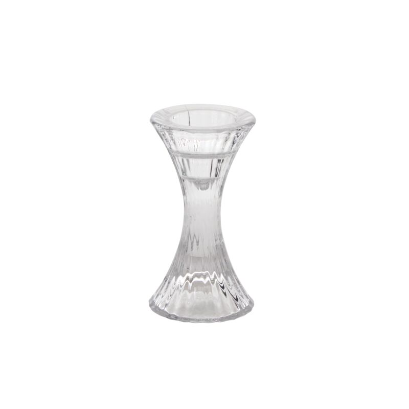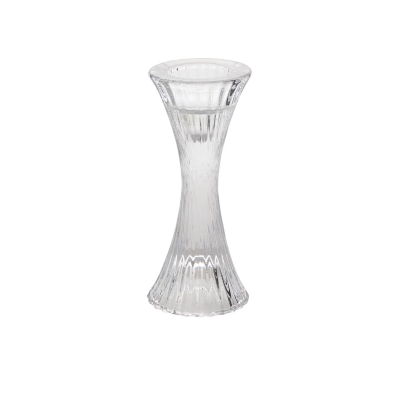 Sleek and curvy, the Monroe Candleholder is a clear, ribbed, hourglass silhouette candle holder that elevates any event tablescape. This shapely style can fit beneath a 4-inch glass sleeve, which is sold separately, or be styled without any covering in the right setting.