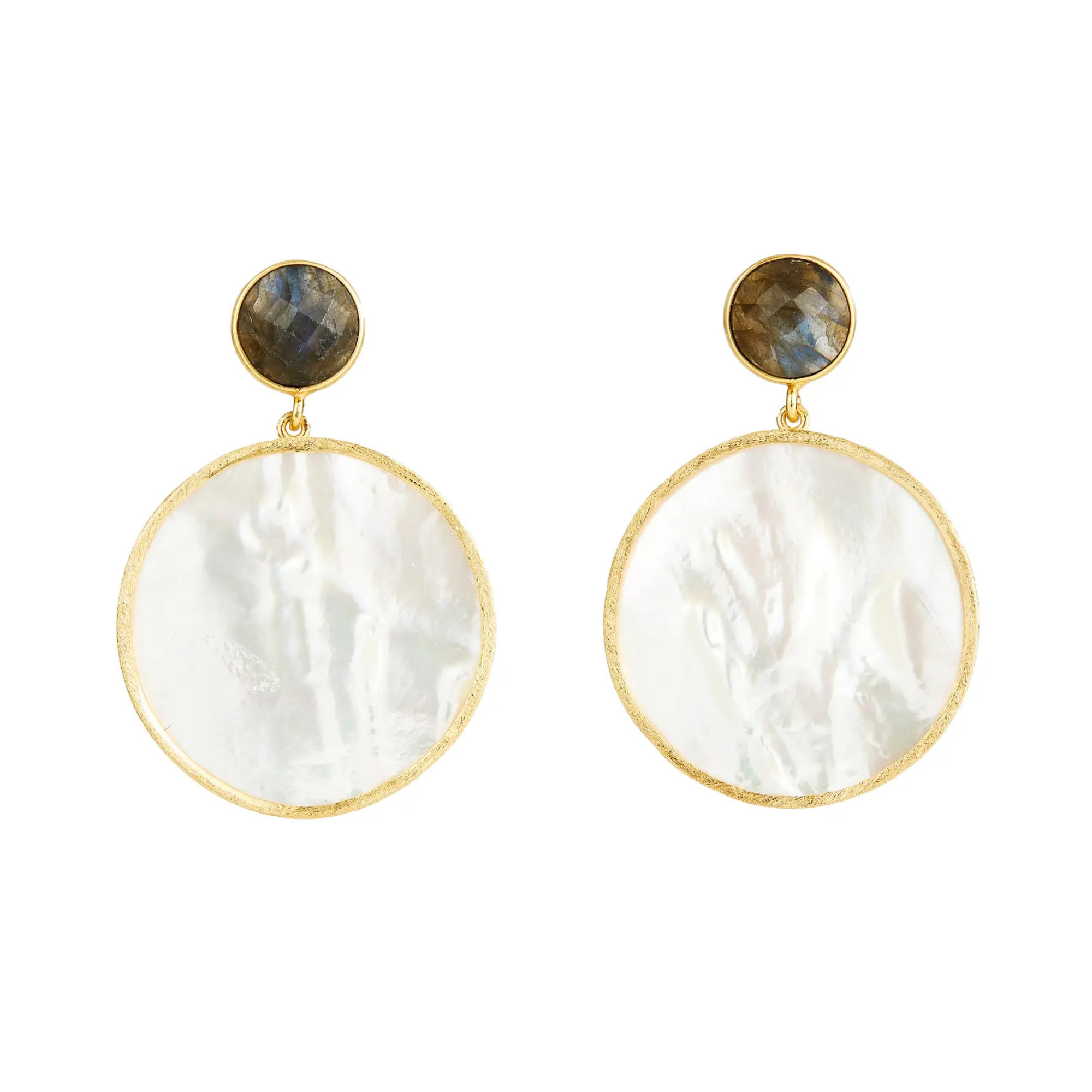 Discover timeless elegance with our Mother of Pearl with Round Labradorite earrings. These stunning pieces feature a luminous mother of pearl backdrop, beautifully complemented by a striking round labradorite gemstone. The iridescent sheen of the mother of pearl creates a soft, pearlescent glow, while the labradorite adds a touch of mystique with its captivating play of colors. The combination of these exquisite materials offers a harmonious blend of classic sophistication and contemporary allure, making these earrings a versatile accessory for both everyday wear and special occasions.