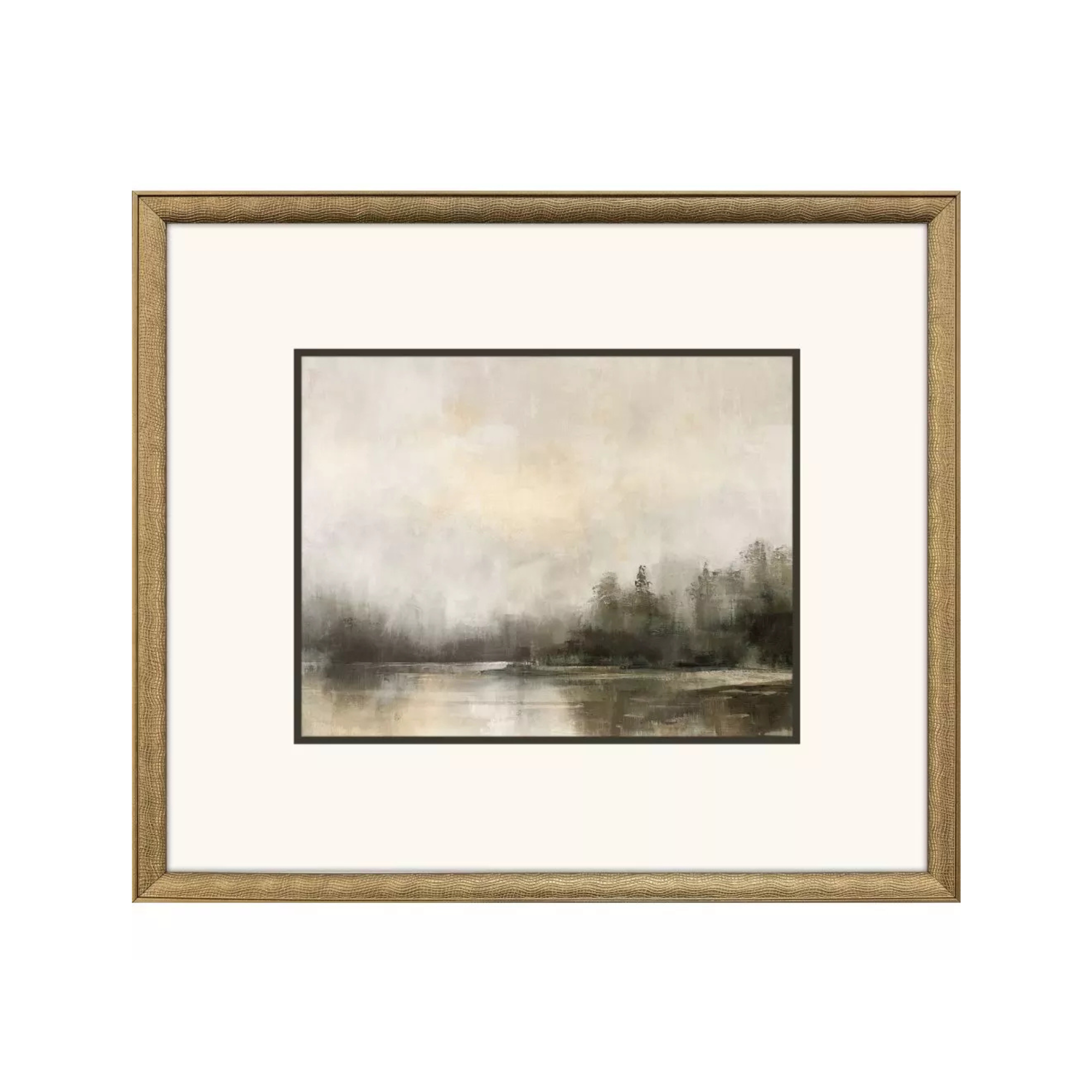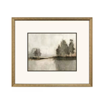 Peaceful landscapes are printed on fine art paper. Neutrally matted and framed in an antique gold wood with embossed weave pattern and charcoal side.