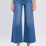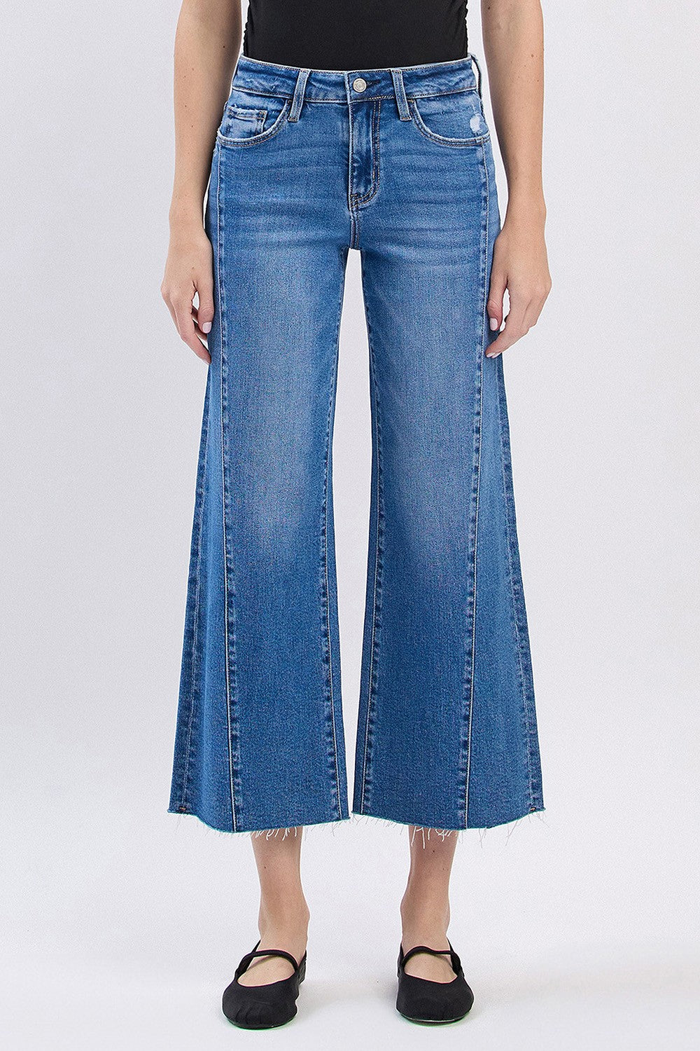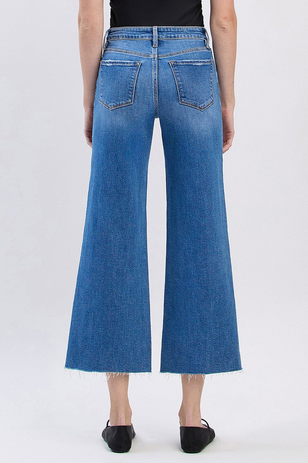 These high-rise wide-leg jeans feature a twisted design and a raw hem for a modern edge. Crafted from comfortable stretch denim, they offer a flattering high-rise waist and a cropped length for versatile styling.