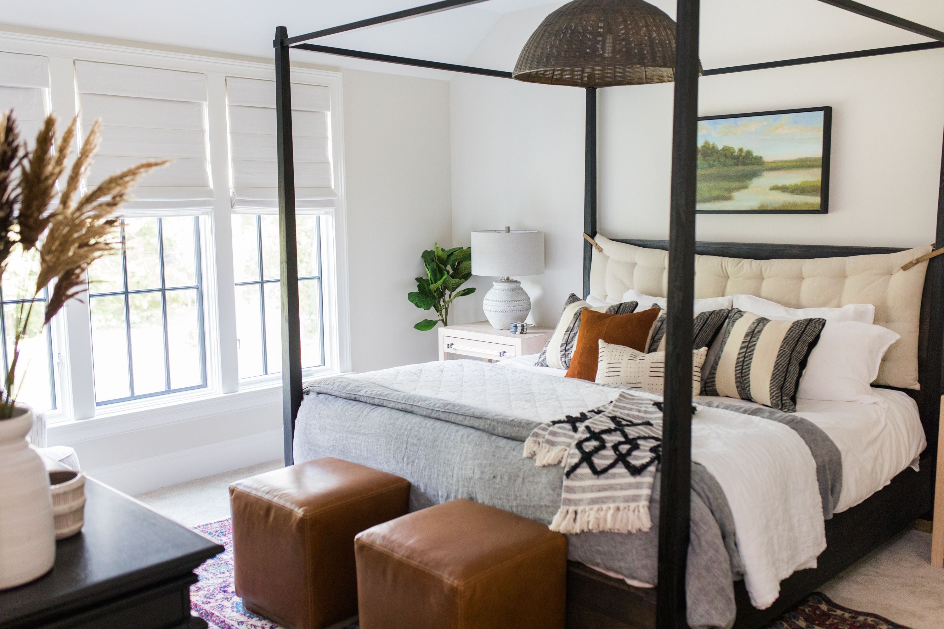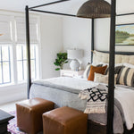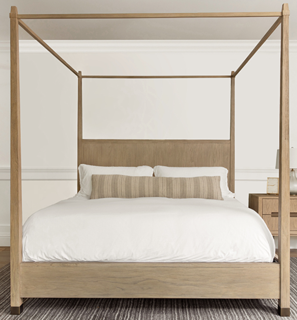 Richly grained, solid teak wood in 3 sandblasted finishes, accented with antique brass feet. Optional upholstered headboard panel available. As seen in Chris and Lauren Lane's home!